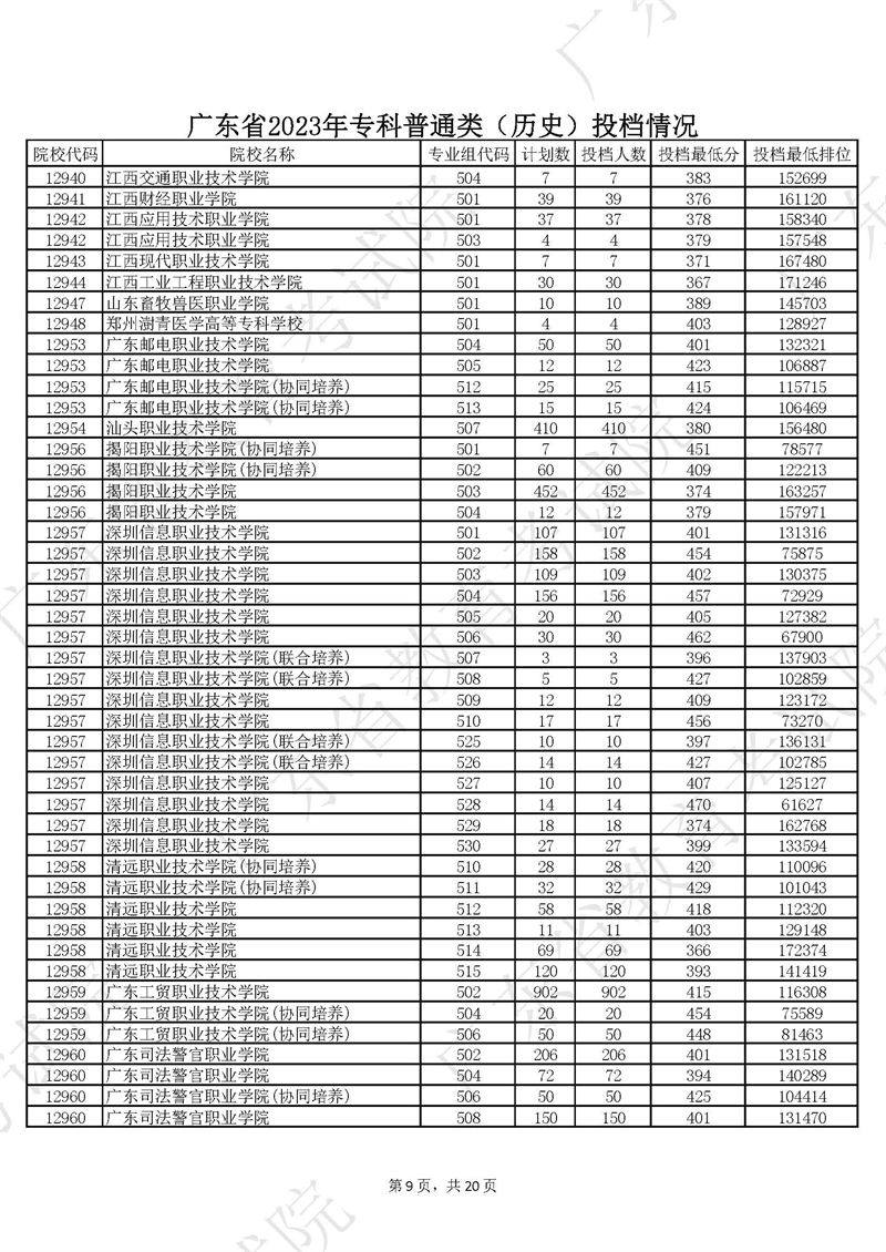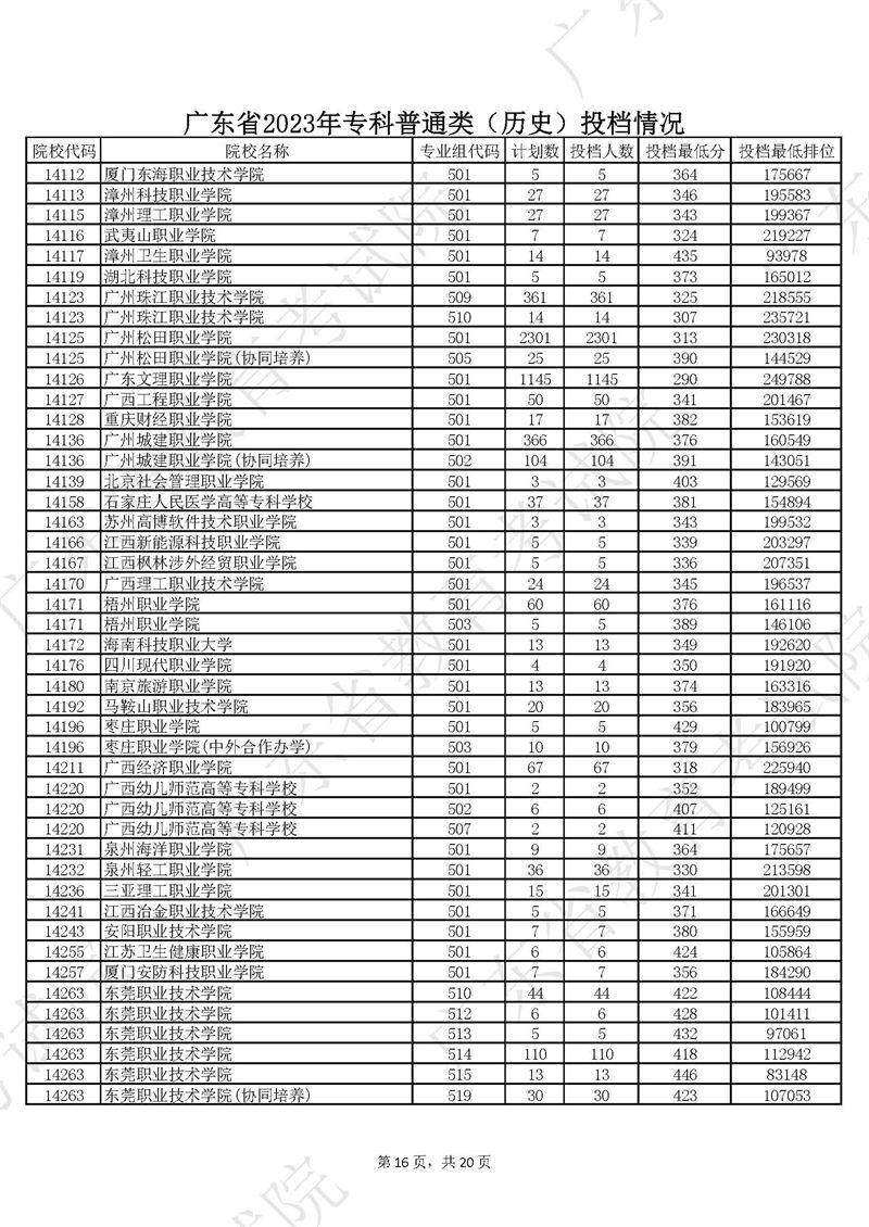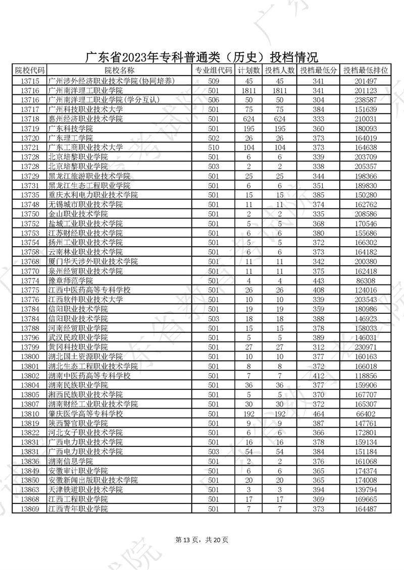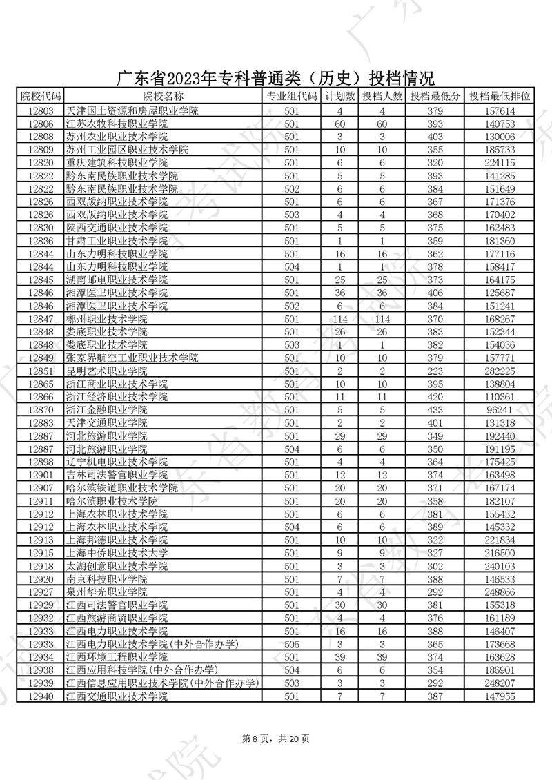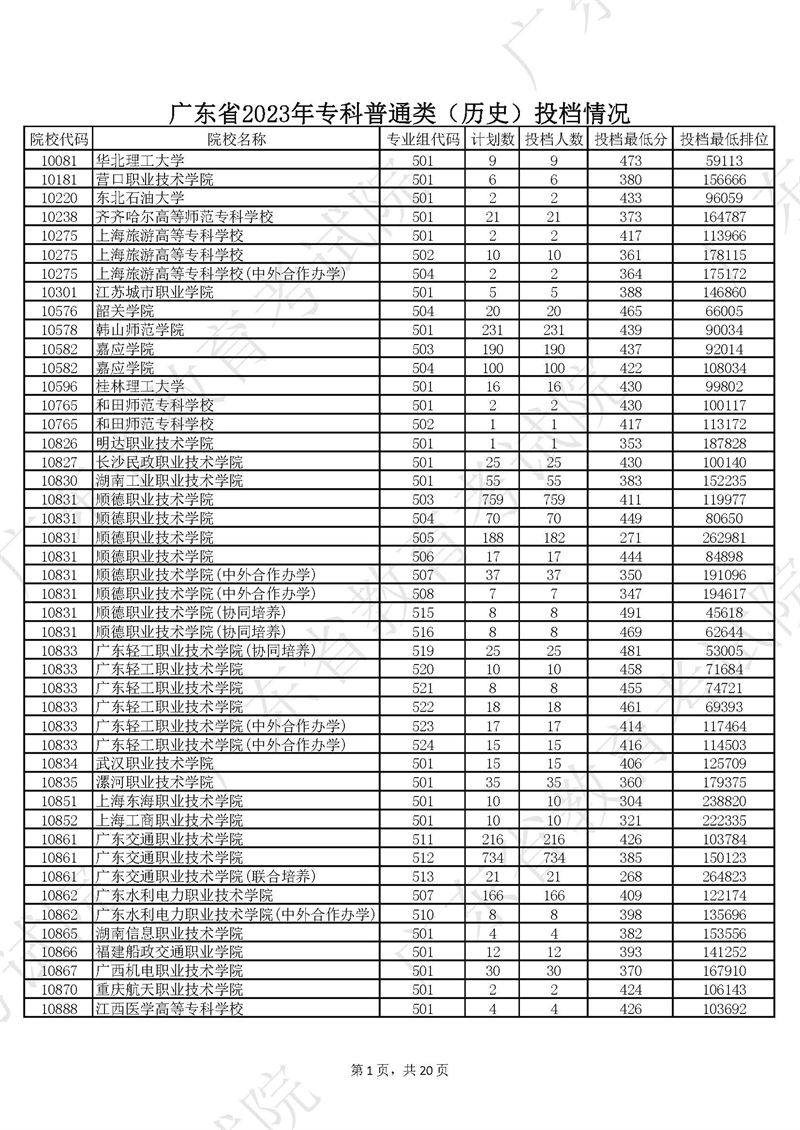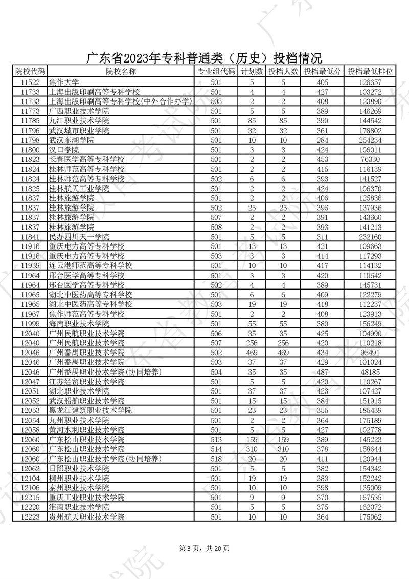 广东省2023年专科普通类历史投档情况