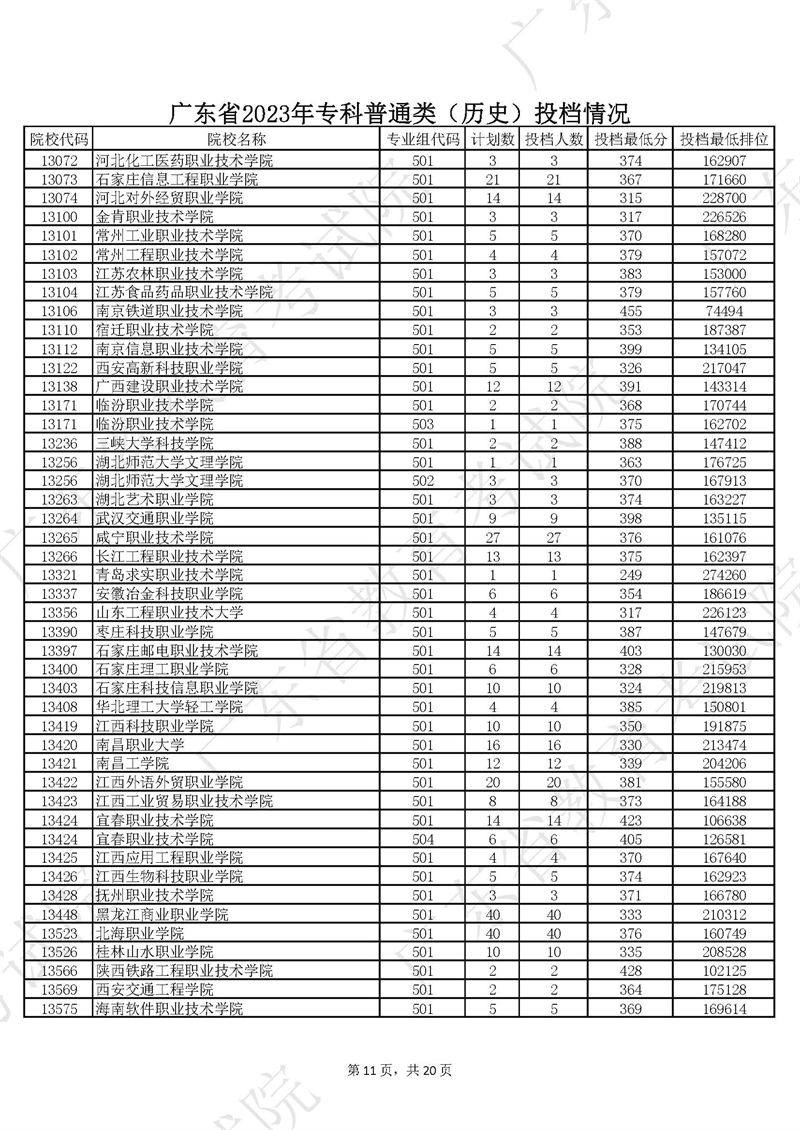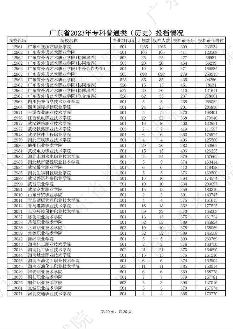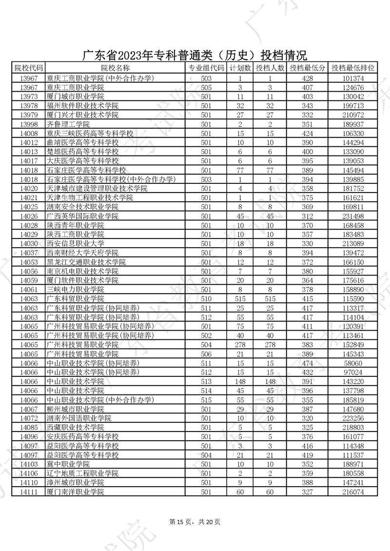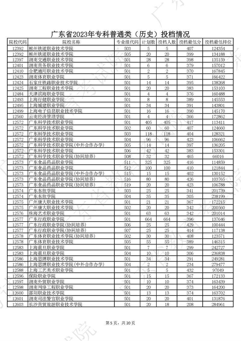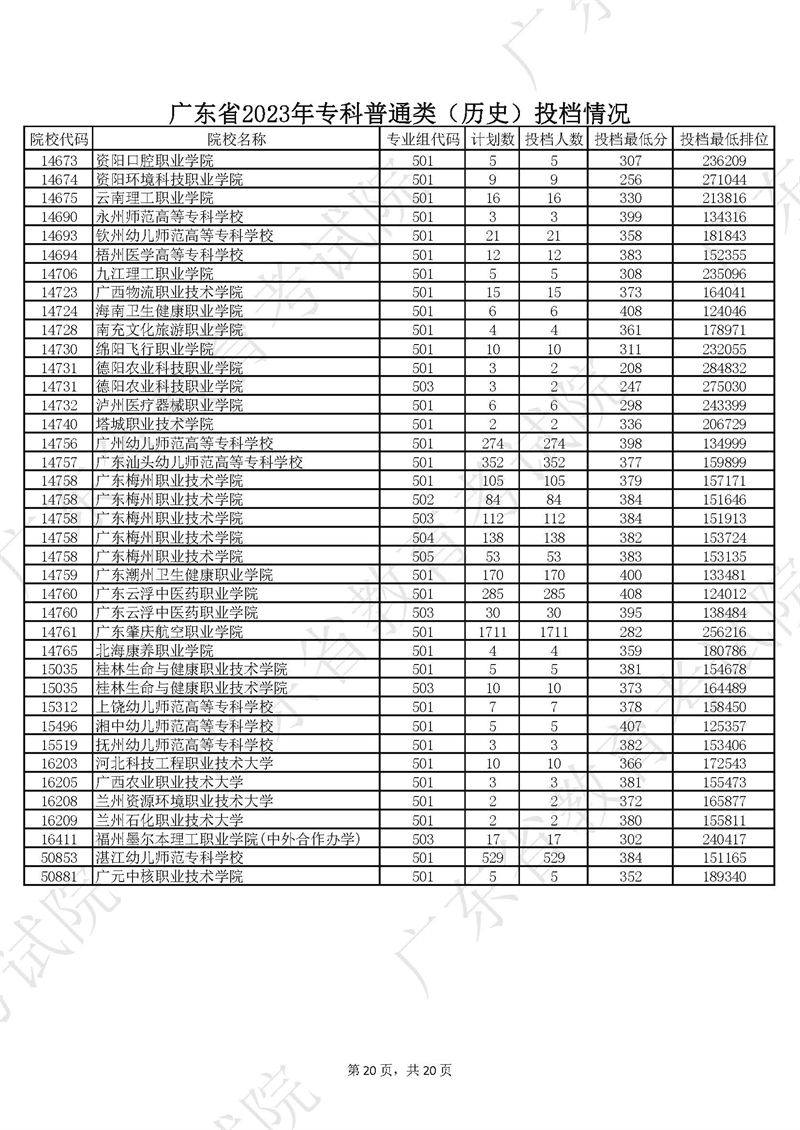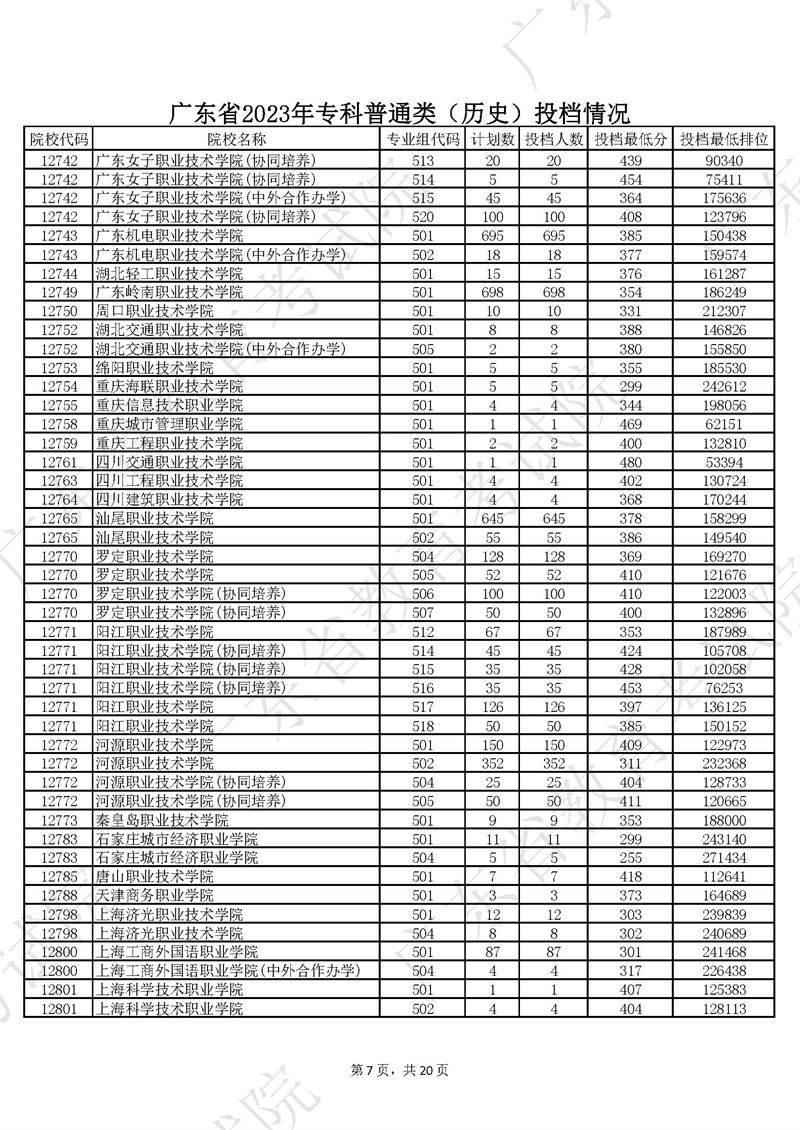 广东省2023年专科普通类历史投档情况
