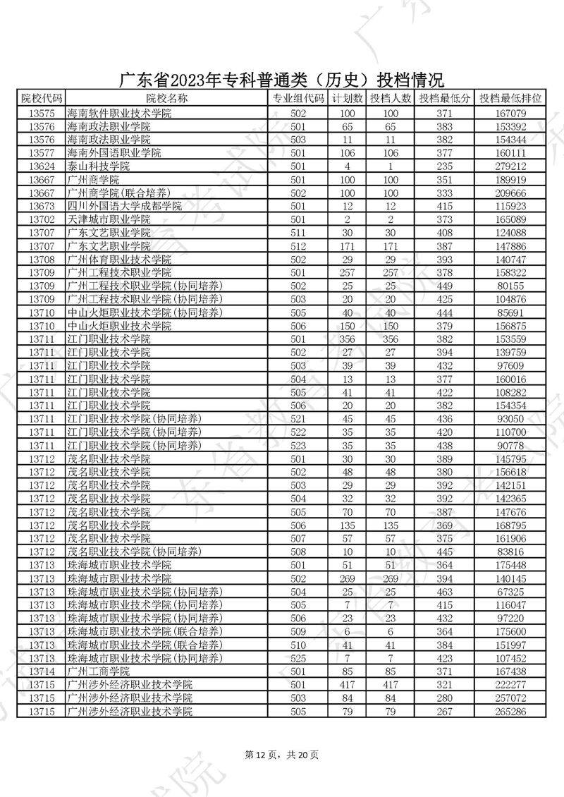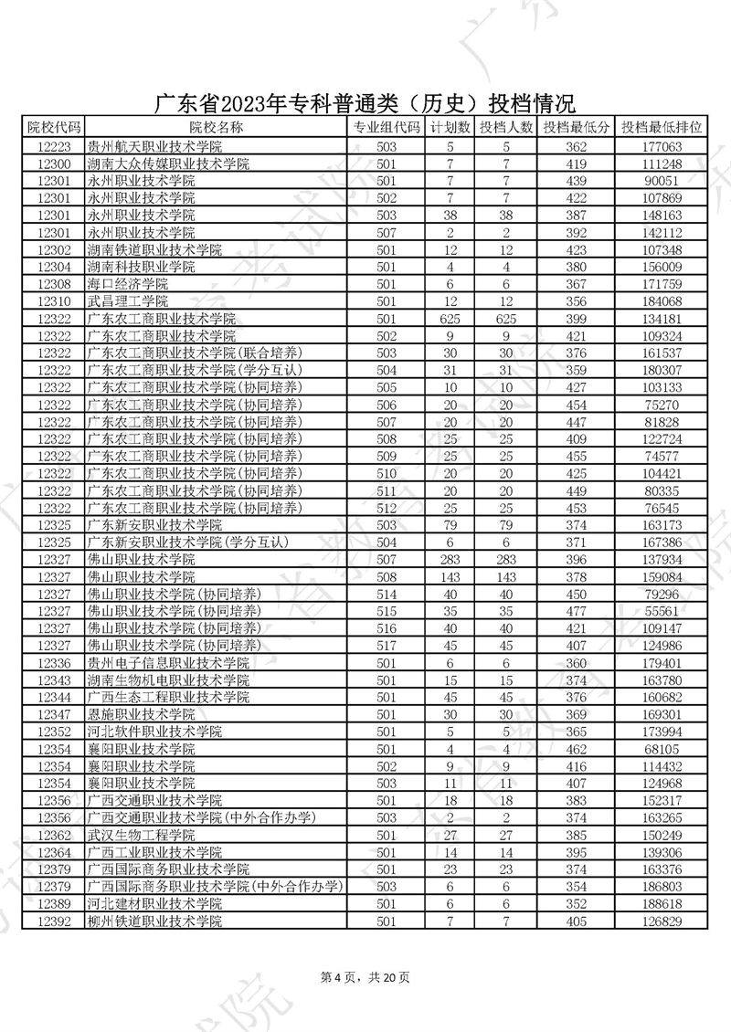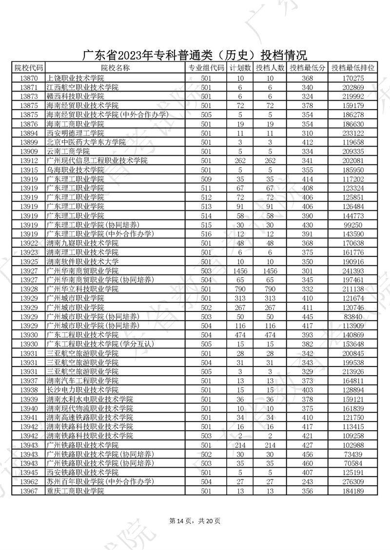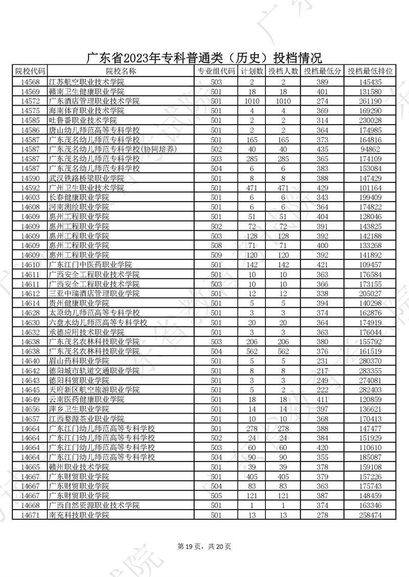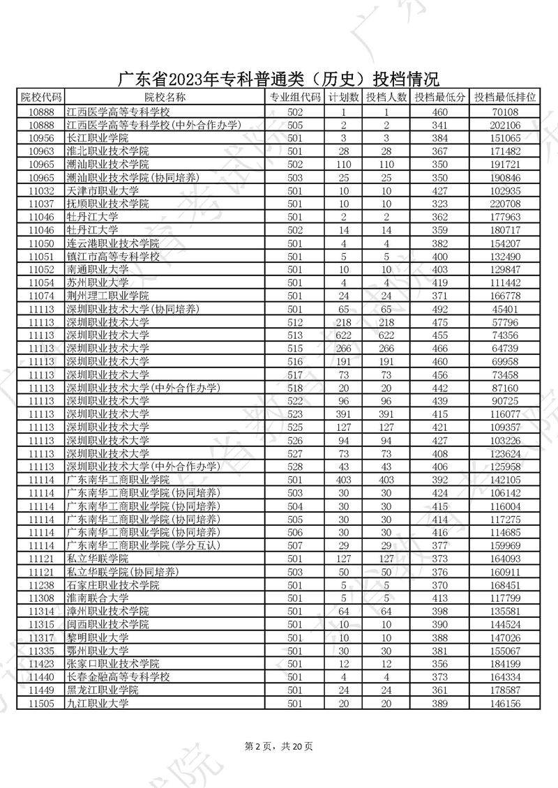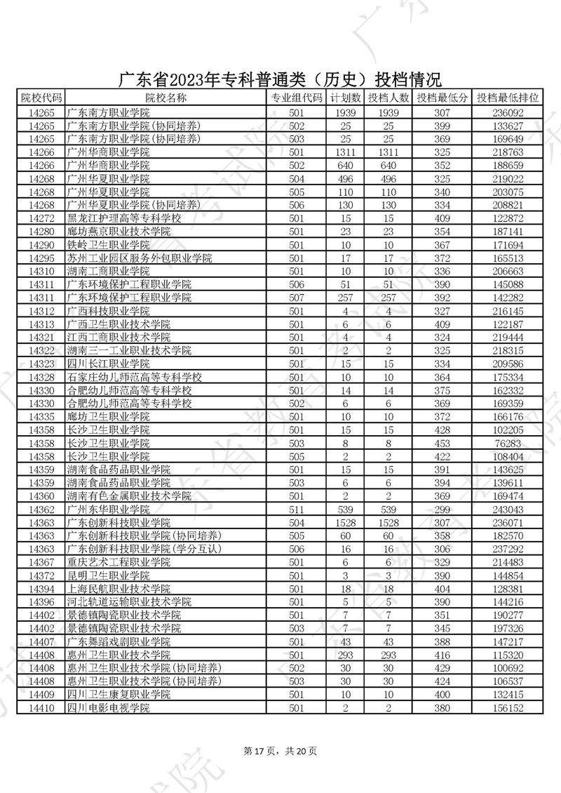 广东省2023年专科普通类历史投档情况