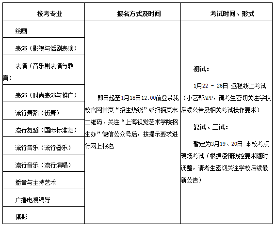 参加我校校考的考生,须在符合各省(市)相关招考规定的基础上,依照我校规定进行报名和考试。我校相关专业在各省(市)的艺术类专业省级统考要求,请参考学校官网公布的《上海视觉艺术学院2022年各省级统考子科类对照表》(点击查阅)。如后续因疫情等原因,考生所在省(市)统考科类有所调整,请以各省(市)考试院最终要求为准。