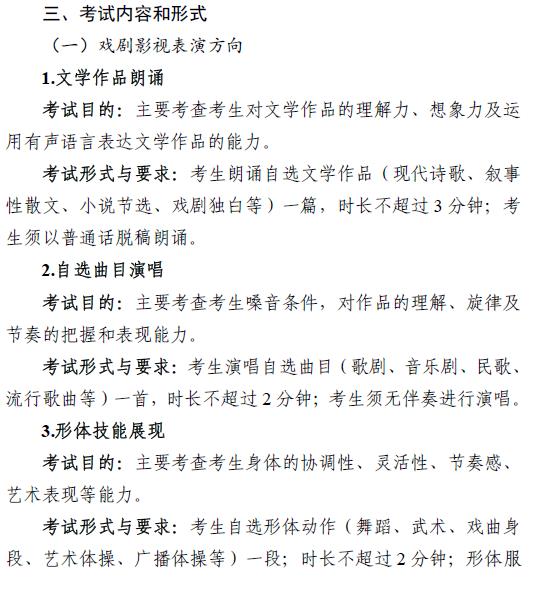 其中戏剧影视表演考试适用于表演(戏剧影视表演方向)、戏剧教育、音乐剧等专业,服装表演考试适用于表演(服装表演方向)等专业,戏剧影视导演考试适用于戏剧影视导演等专业。