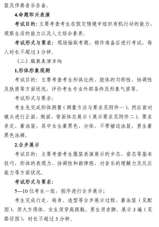 注:服装表演方向各科目考试中,考生不可化妆,不得穿丝袜,不得佩戴饰品及美瞳类隐形眼镜,发式须前不遮额、后不及肩、侧不掩耳。