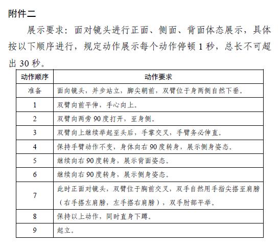 考试形式与要求:考生先以普通话自我介绍,不可透露姓名等个人基本信息,时长不超过1 分钟;然后从舞蹈、健美操、艺术体操等体现肢体动作的才艺中自选一种进行展示,时长不超过2 分钟,服装及伴奏音乐自备。