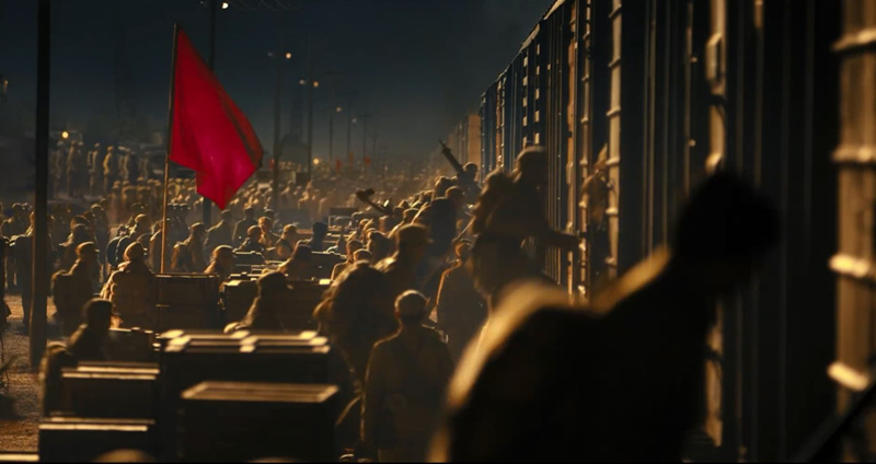 首先,多重叠置的长镜头撑起战争史诗般的宏大叙事。《长津湖》运用了大量的长镜头,展示雪山、长城、列车、荒滩、仁川港、部队调遣、坦克车队、轰炸机群、撤离败退的美军舰队、美军圣诞晚餐、冰雕连的冰洁群像等,或融合环境、或提升意境、或形成鲜明对比。烘托恢弘的战争场面、形成宏大叙事,成就了史诗般的电影。
