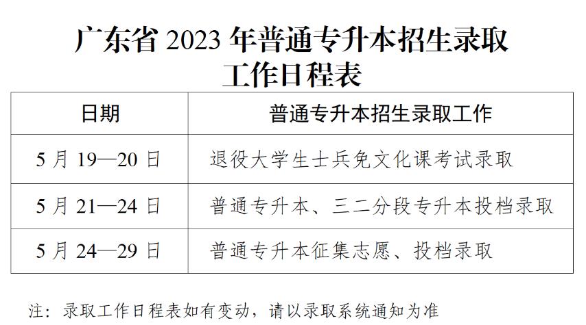 我省普通专升本招生录取工作(含三二分段转段考核、退役大学生士兵免文化课考试,下同)将于5月19日至29日进行。为做好广东省2023年普通高等学校专升本招生录取工作,现将有关事项通知如下。