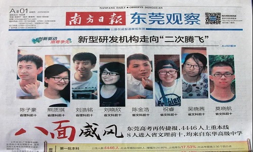 ◆2012—2018年,广东省高考文理总分屏蔽学生共160人,我校占23人,全省第一。2014-2017年连续4届进入“省前10名”的人数居全省第一。2015年8人进入广东省文理科总分前十名,包揽全省文科总分前三名,祝睿同学获广东省文科总分第一。
