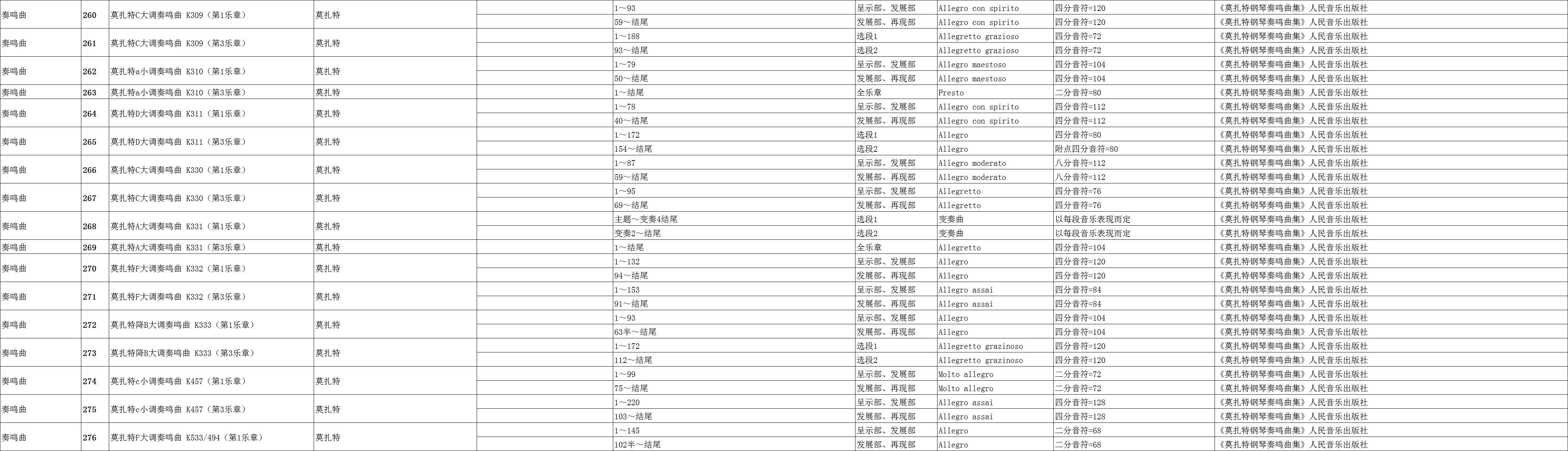 钢琴奏鸣曲规定曲目260 莫扎特C大调奏鸣曲 K309(第1乐章) 莫扎特 1~93 呈示部、发展部 Allegro con spirito 四分音符=120 《莫扎特钢琴奏鸣曲集》人民音乐出版社