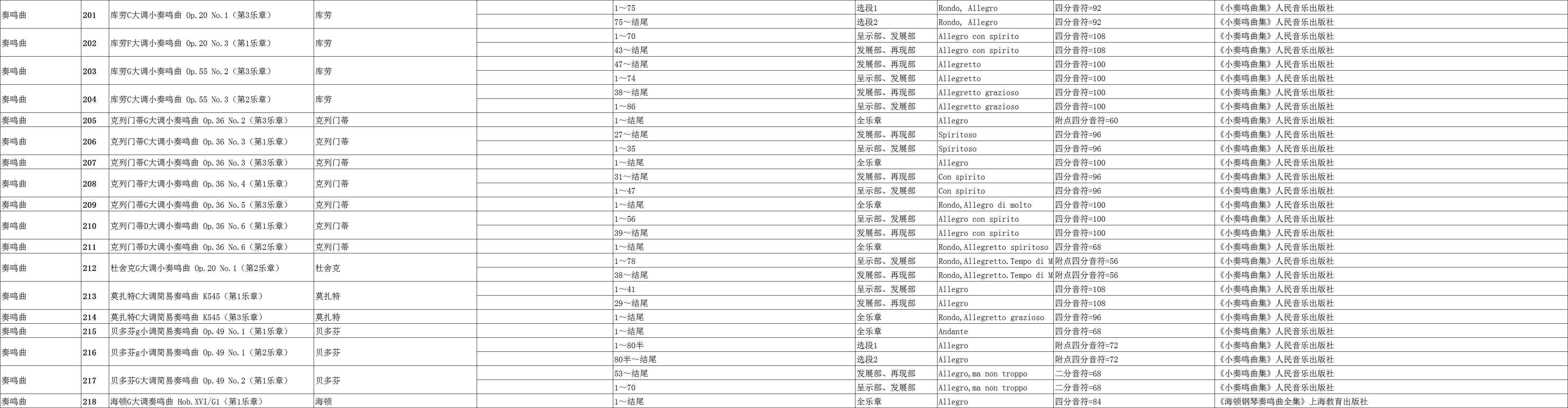 钢琴奏鸣曲规定曲目201 库劳C大调小奏鸣曲 Op.20 No.1(第3乐章) 库劳 1~75 选段1 Rondo, Allegro 四分音符=92 《小奏鸣曲集》人民音乐出版社 选段2 75~结尾 Rondo, Allegro 四分音符=92 《小奏鸣曲集》人民音乐出版社