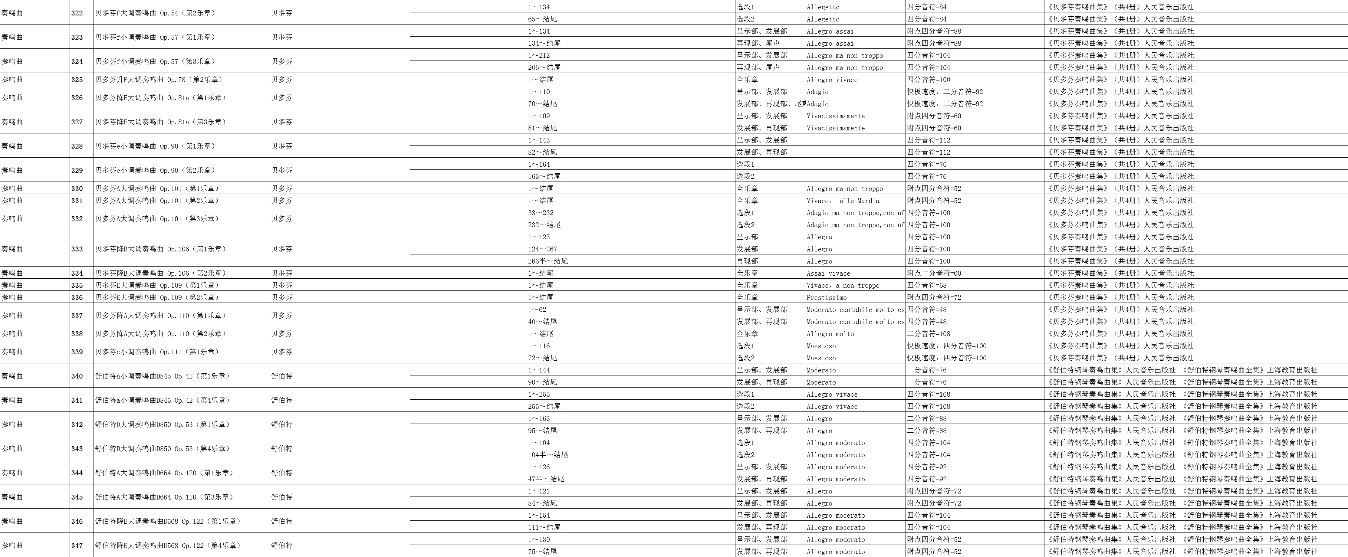 钢琴奏鸣曲规定曲目324 贝多芬f小调奏鸣曲 Op.57(第3乐章) 贝多芬 1~212 呈示部、发展部 Allegro ma non troppo 四分音符=104 《贝多芬奏鸣曲集》(共4册)人民音乐出版社