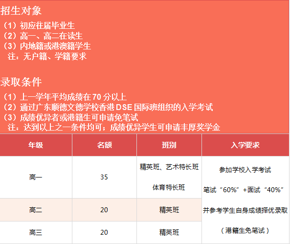 广东顺德文德学校香港DSE国际班于2021年开拓了与香港公立中学的合作渠道,建立中港两地交换生计划,保留精英班的同时,增设国内唯一的DSE艺术班和体育班。学校拥有一支顶级的国际教育教师队伍为学生提供专业的教育服务,致力为国家培养优秀的国际化人才。