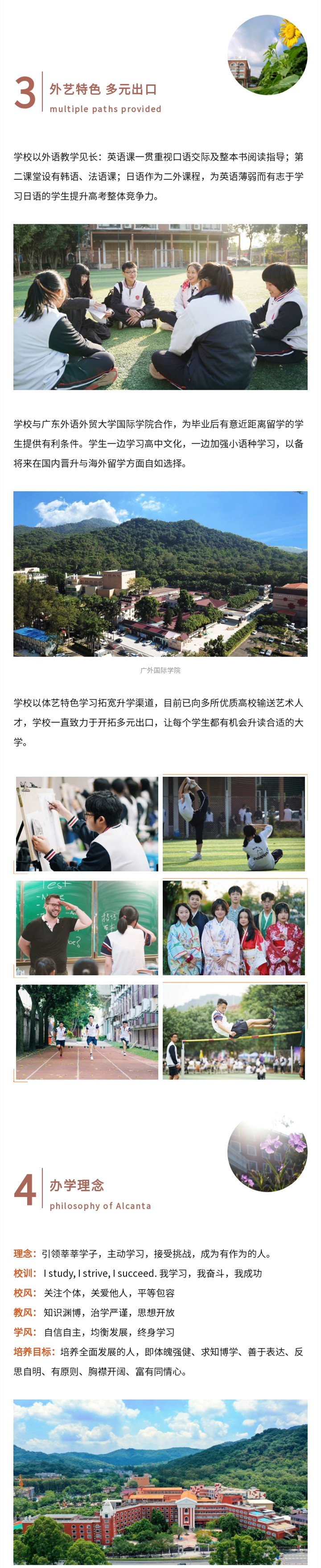 学校位于白云山西麓,校园精致典雅,环境优美宁静,教学设施齐备,广州市亚加达外国语高级中学招生简章师资配备精良。学校实行寄宿制,进行小班教学。亚加达外国语高级中学管理严格规范,教学严谨求实。亚加达外国语高级中学倾力为外语、体育、音乐、美术、传媒等方向发展的学生创设条件,亚加达外国语高级中学提供多元升学通道,帮助每一名学生实现升读适合大学的梦想。学生可以到广州多芬传媒学习传媒专业,参加艺考!