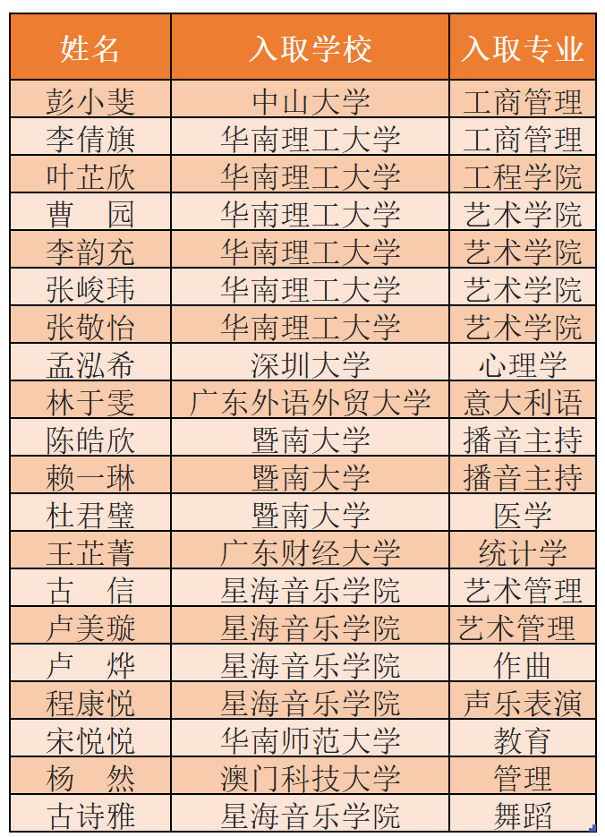 2021年广州市第十六中学(校本部) 高中艺术(合唱、管弦乐)特长生 招生简章 广州市第十六中学是一所具有87年历史的广东省国家级示范性高中。为了提高我校艺术教育水平,丰富校园文化生活,全面推进素质教育,同时也为拥有合唱、管弦乐特长的学生提供继续学习的机会,带动学校艺术团队的持续发展,根据《广州市教育局关于做好2021年广州市普通高中招收体育艺术特长生招生工作的通知》,2021年我校面向广州11区招收高中艺术特长生,合唱10人,管弦乐10人。 一. 培养目标 坚持文化学习与艺术特长两手抓,把我校的合唱、管弦乐特长生,培养成一专多能、品学兼优的好学生。我校合唱、管弦乐特长生,可参加全国普通高等院校考试,也可以侧重向音乐学院、综合大学艺术学院、普通高等院校音乐系、戏剧学院、艺术学院、传媒大学等方向发展。历年来,我校的艺术特长生,在各种教育行政部门举办的音乐艺术展演、艺术比赛活动中,都名列前茅,为全国各大音乐院校、师范大学音乐系,以及省市电视台、芭蕾舞团、交响乐团、广东省各中小学,输送了一批批优秀的艺术人才。 管乐团 星海音乐厅演出 二. 特长生高考录取学校举例 我校于2010年首次招收高中艺术特长生,近年来,我校高中艺术特长生高考录取情况举例如下: 三. 授课方法 1、艺术特长生教育:我校是首批广州市艺术教育重点基地项目学校、首批广东省中小学艺术教育特色学校、广州市首批中小学高水平美育团队学校,高中艺术教育是我校的一个特色。针对艺术特长生的特点,我校在师资配备、课程开设、教学计划、专业训练、日常管理等,为艺术特长生的培养找到了一个科学合理的途径。同时,依据高校对艺术专业的要求,我校开展“个别课、小组课、团体课、艺术实践课”四种教学模式,既不影响文化课的学习,又提高了专业课水平,为高考冲刺打下了坚实的基础。 行进打击乐 2、合唱团特色课程:合唱训练、合唱演唱技巧、视唱练耳音乐理论课培训、意大利语课程等。同时开设《优雅淑女班》课程培训:形体礼仪、中西餐礼仪、旗袍步态、彩妆、茶艺、插花艺术、青少年房间及物品收纳整理等课程,培养学生良好的生活习惯、高贵典雅的气质、文明时尚的行为举止,努力使学生成为道德礼仪高尚、行为规范典雅、高素质的综合型人才。 合唱队参加《我和我的祖国》展演 3、管弦乐团特色课程:聘请国内外著名管弦乐专家为我校管弦乐团辅导,长期开设管弦乐专家讲座、举办管弦乐沙龙、进行管弦乐交流活动;聘请声部专业教师,开设各类乐器专业演奏技巧、视唱练耳专业理论课,同时还开设“行进打击乐”特色培训等课程。 管乐团代表广州市参加俄罗斯叶卡捷琳堡建市295周年交流活动 四. 艺术专业报名条件 1、报考我校艺术(合唱、管弦乐)项目的特长生,必须符合以下其中一项:(1)具有广州市户籍和正式学籍的初中毕业生。(2)政策性照顾的异地借读生享有与本市户籍的初中毕业生同等报名资格。(3)具有老三区(越秀、海珠、荔湾)三年初中完整学籍、父母一方或其他监护人持有在我市办理且在有效期内的《广东省居住证》的非本市户籍初中毕业生。 2、报考我校艺术特长的学生必须热爱艺术、品行端正、尊敬师长、遵纪守法、作风正派、有较强的上进心、勤奋好学、身体健康。综合表现评价A等,成绩良好。 3、报考艺术(合唱)特长生,要求有合唱基础,较好的音色、音准、节奏感和音乐表现力。报考艺术(管弦乐)特长生,要求有良好的乐器演奏和优秀的乐团合作能力,有较好的乐感、音色、音准和音乐表现力。 具体须符合以下条件之一: (1)获得教育行政部门主办的国家、省级、市级各类艺术专项比赛三等奖以上。 (2)获得区级教育行政主管部门举办的各类艺术专项比赛二等奖以上。 (3)获得其他大型国际比赛获奖的个人或集体项目获奖者(需为金奖以上并经市教育局体卫艺处确认), (4)获得国际奥林匹克合唱比赛铜奖以上。 (5)参加“羊城学校美育节”系列展演活动演出者(获得市教育局颁发的展演证书) (6)广州青年交响乐团入团满一年以上团员且代表乐团参加正式交流演出(必须出具团员证明和演出证明) 获奖证书有效期为2018年5月1日至2021年4月30日。 五. 报名与测试 1.网上申报: 符合艺术特长生招生条件且需要报考的考生,须中考报名期间(5月9日-13日),在广州市高中阶段招生考试服务平台(网址:http://zhongkao.gzzk.cn/)填报获奖项目、获奖等级和证书等级等相关信息。每名考生只能报考一所对口项目的招生学校。 请有意报考我校特长生的考生,请在 4月 28日 22:00点前,登录以下链接填写《2021年广州市第十六中学普通高中体育、艺术特长生报名表》。https://www.wjx.top/jq/37614500.aspx 5月10日至5月13日期间, 在广州市高中阶段学校招生考试服务平台打印《广州市普通高中招收体育、艺术特长生报名表》。 2.现场报名: 由于防疫需要,请按指定时间将报名表交至16中校本部(中山二路37号)7楼教导处谭娟娟老师处,并完成现场报名工作。报名时间:5月10日至5月13日,每天上午8:30-11:30,下午2:30-5:00 现场报名需提交以下材料:(1)《广州市普通高中招收体育、艺术特长生报名表》。(2)个人简历和有效获奖证书原件与复印件。(3)户口本原件(审核后马上返回)。(4)由毕业学校出具的初三上学期期末考试、初三下学