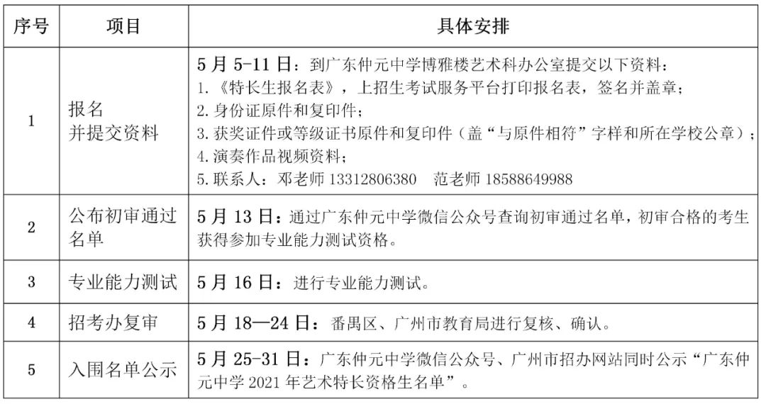 2.专业测试总成绩未达到60分者,视为专业不合格,专业不合格者不能划定为广东仲元中学艺术特长资格生,艺术特长资格生名单报送上级主管部门审核。