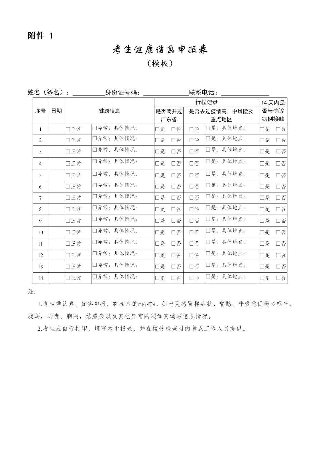 (一)所有报名考生考前14天非必要不离开广州市,同时如实填写考前14天个人健康信息申报表(见附件1)。在考试当天持健康绿码和48小时内核酸检测阴性证明(电子或纸质证明均可),并在参加每场考试时提交给考场相关工作人员。
