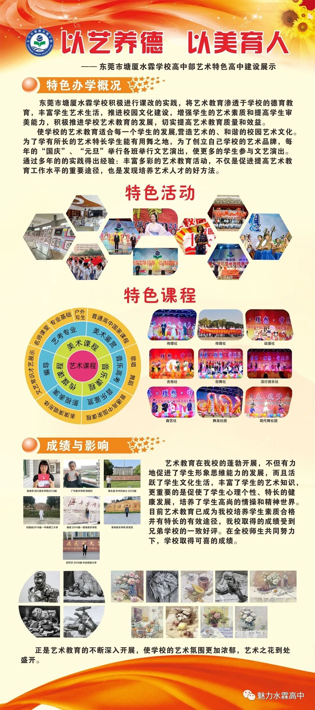 全方位的育人环境与模式,学校致力于满足学生全面发展的需要,新建综合艺术楼,增设音乐、舞蹈、美术、传媒、日语等专用课室,并内外结合,配备教学水平高的专业教师。近几年考入华中科技大学、中山大学、中国美术学院、华南理工大学、中国体育大学、中国民族大学、广东星海学院、广州美术学院、四川美术学院、四川音乐学院、四川传媒学院、广州体育学院等大学的艺体类考生,也在逐年增多。