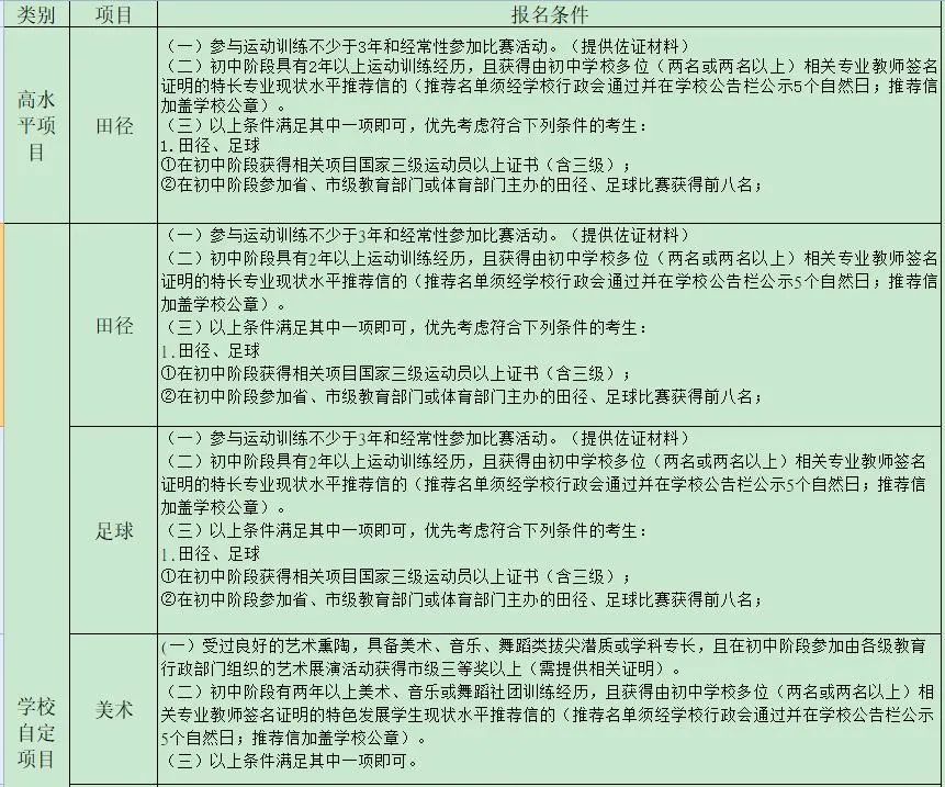 凡符合我市普通高中学校报考条件,且具有学科特长或创新潜质的初三毕业生,可报名参加自主招生。各项目报名要求符合的条件如下: