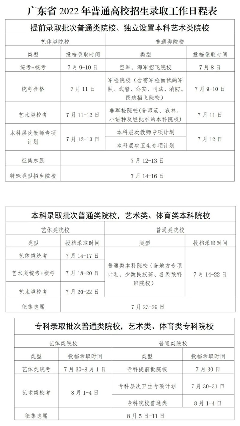广东省2022年高考招生录取工作将于7月8日至8月11日进行。其中,提前批为7月8日至16日,本科批为7月14日至29日,专科批为7月30日至8月11日。