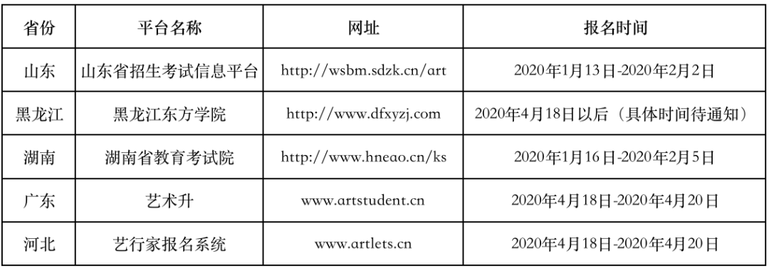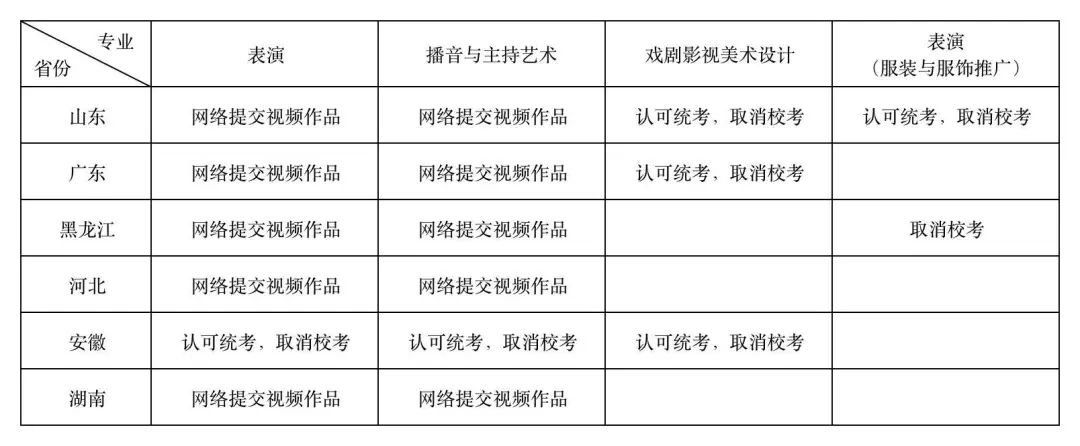 根据教育部关于艺术类考试相关要求,为保障疫情防控形势下广大考生和考试工作人员身体健康和生命安全,经学校研究决定,对山东、广东、黑龙江、河北、安徽和湖南等六个尚未组织考试省份的艺术类专业校考调整,如下: