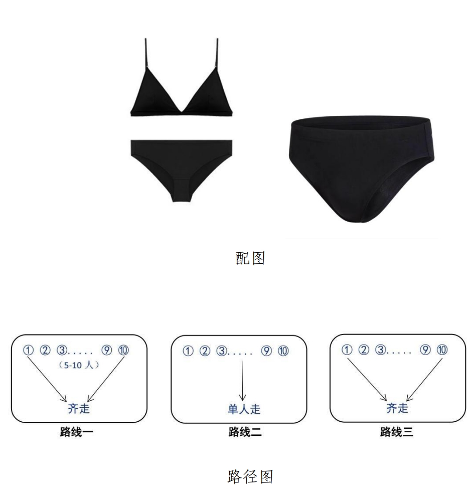 泳装要求:黑色分体式泳装,不能出现任何LOGO标识。女生泳装为比基尼,不能有任何花边、绳子等装饰,泳裤为三角式,不能为裙式。男生上身赤裸状态,下身泳裤为三角式,不能为平角裤。如图: