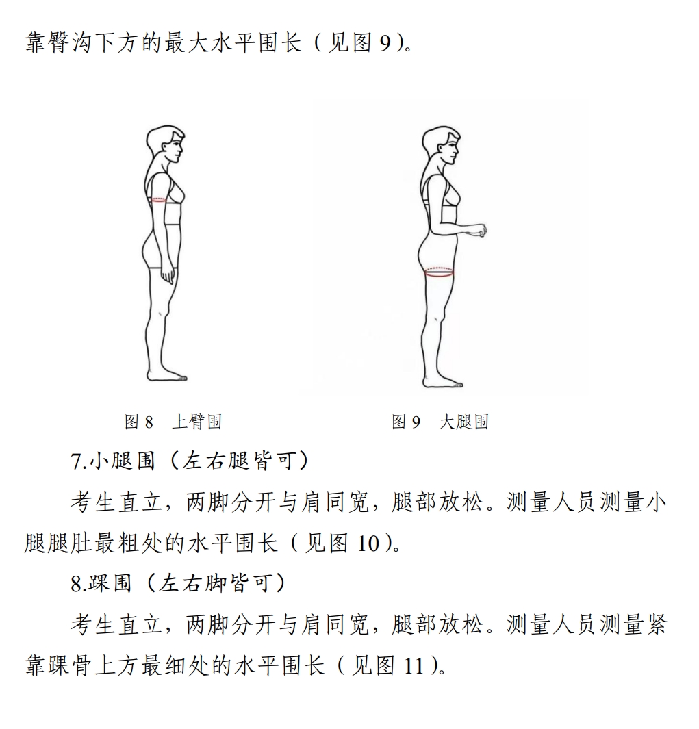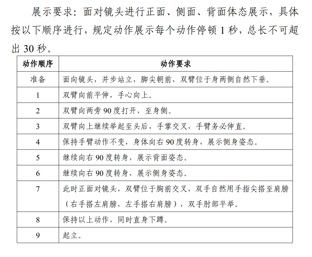 考试形式与要求:考生先完成形体测量(测量方法与要求见附件一),然后面对镜头进行正面、侧面、背面体态展示(展示要求见附件二)。要求赤足、着泳装,其中女生着黑色、分体、不带裙边泳装,男生着黑色泳裤。