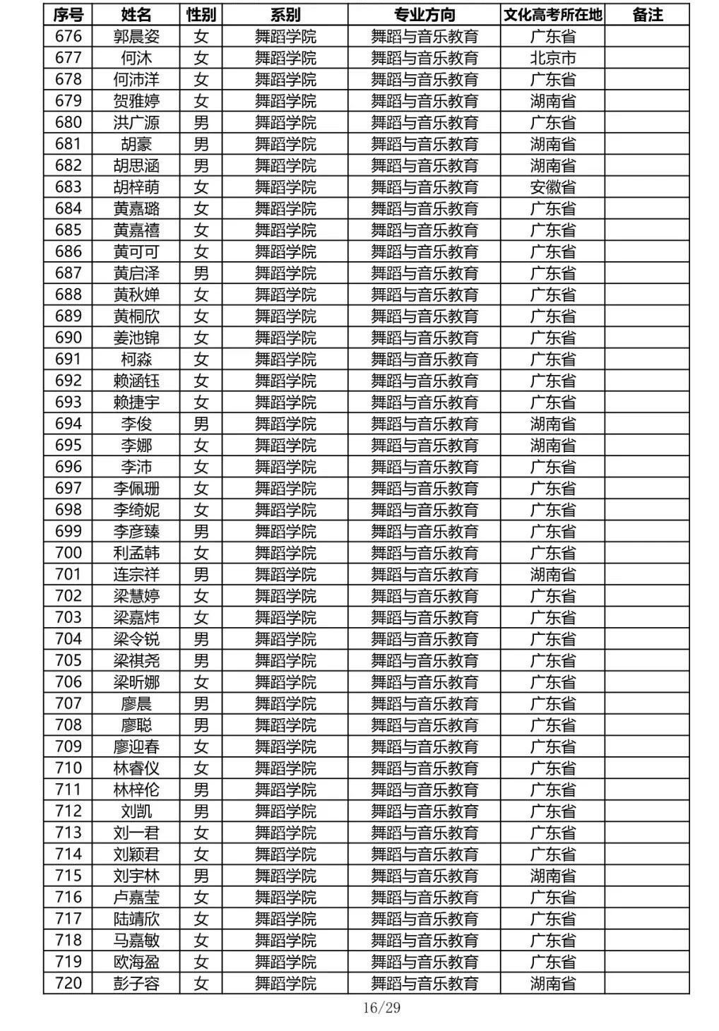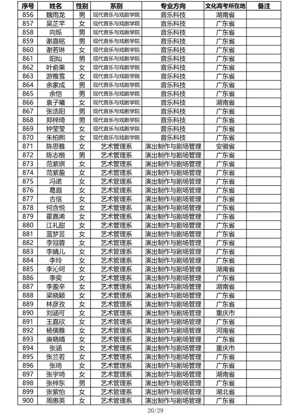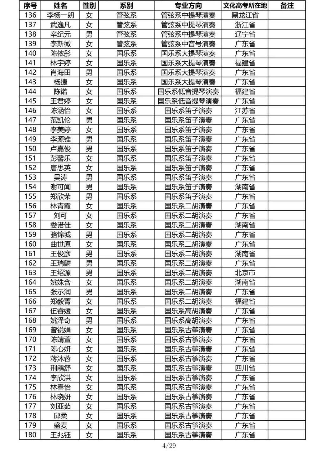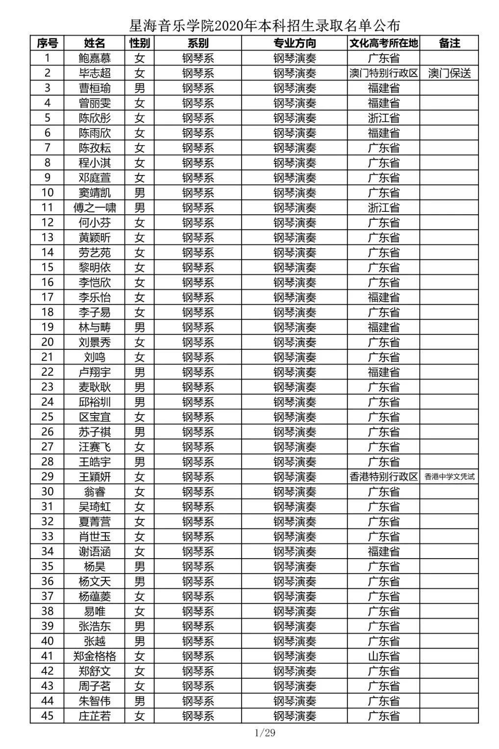 星海音乐学院2020年本科招生录取名单