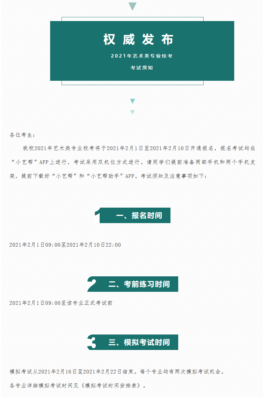 四川传媒学院2021年艺术类专业校考将于2021年2月1日至2021年2月10日开通报名,报名考试均在“小艺帮”APP上进行,考试采用双机位方式进行。请同学们提前准备两部手机和两个手机支架,提前下载好“小艺帮”和“小艺帮助手”APP。考试须知及注意事项如下:报名时间:2021年2月1日09:00至2021年2月10日22:00考前练习时间2021年2月1日09:00至该专业正式考试前