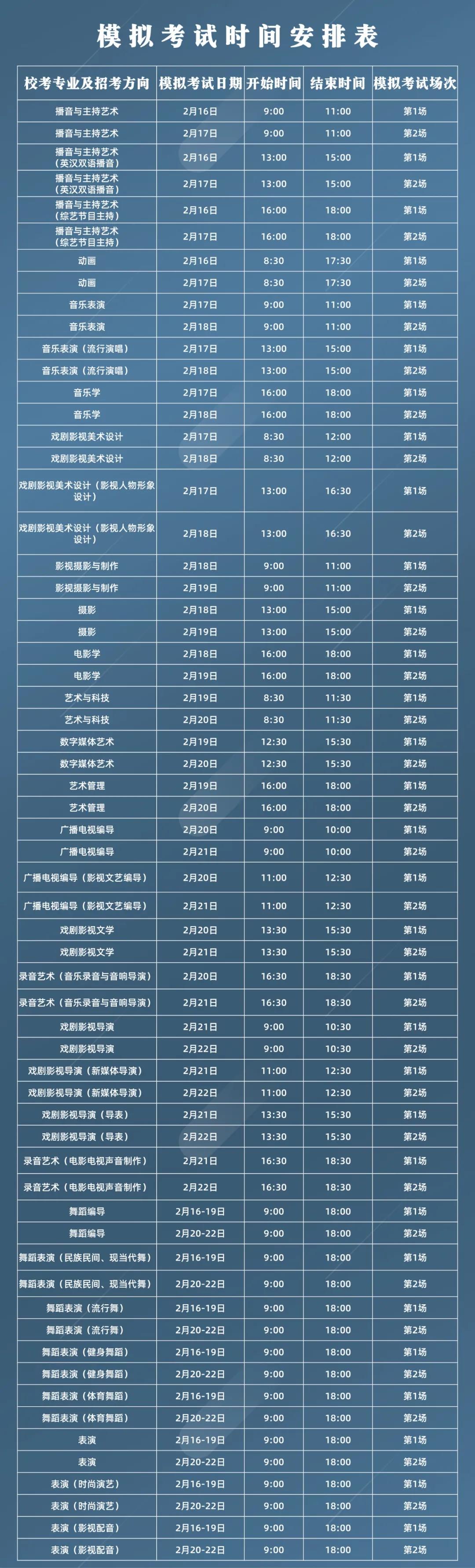 (1)艺术管理、电影学、戏剧影视文学、广播电视编导、广播电视编导(影视文艺编导)、戏剧影视导演、戏剧影视导演(导表)、戏剧影视导演(新媒体导演)、影视摄影与制作、摄影、音乐表演、音乐表演(流行演唱)、音乐学、录音艺术(音乐录音与音响导演)、录音艺术(电影电视声音制作)、播音与主持艺术、播音与主持艺术(英汉双语播音)、播音与主持艺术(综艺节目主持)。