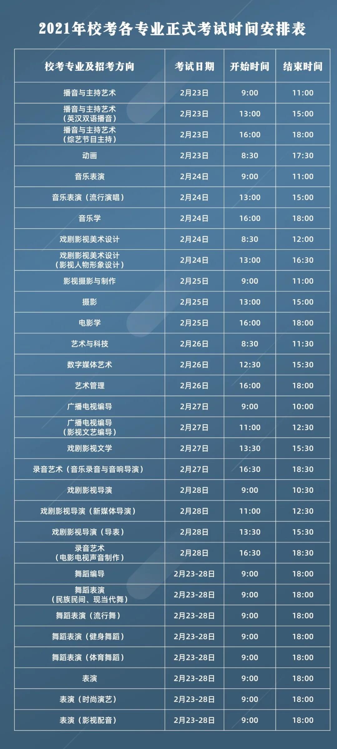 详细安排见《2021年校考各专业正式考试时间安排表》。