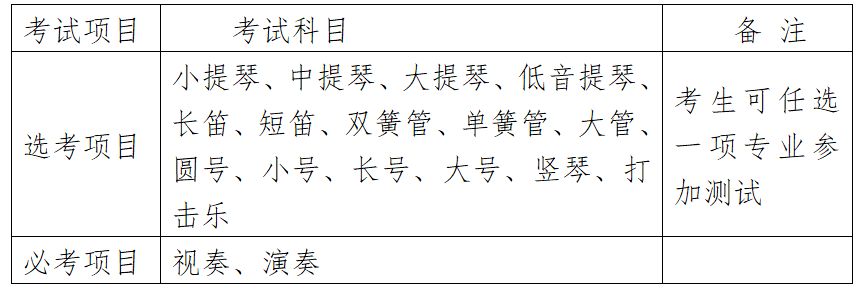 (其中管弦乐包括小提琴、中提琴、大提琴、低音提琴、长笛、短笛、双簧管、单簧管、大管、圆号、小号、长号、大号、竖琴、打击乐;美术包括绘画和书法)