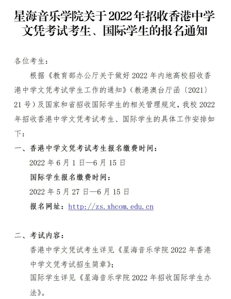星海音乐学院2022年招收香港中学文凭考试考生、国际学生报名通知