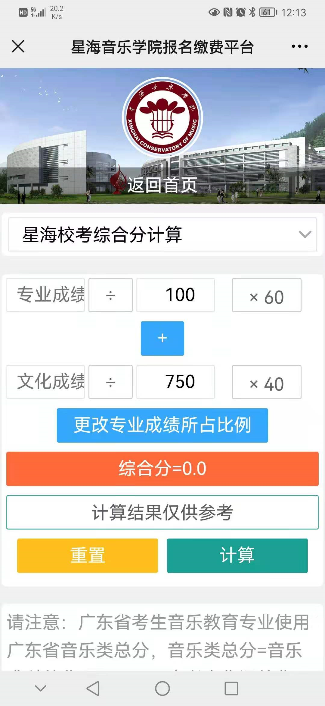 考生可关注“星海音乐学院招生办”微信公众号,在公众号里进行综合分的测算,测算结果仅供参考。
