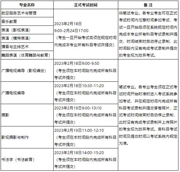 各专业正式考试时间详见下表,未按规定时间和要求参加正式考试,以及未按考试要求完成录制及提交的,后果由考生本人承担。请严格按照后期公布的各专业考试方案规定着装,准备考试场地、用具等,违反者取消考试资格。