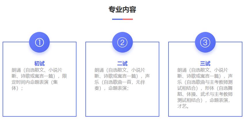 主要课程:声乐 / 台词 / 表演 / 语言基础 / 形体礼仪 / 考试技巧等
