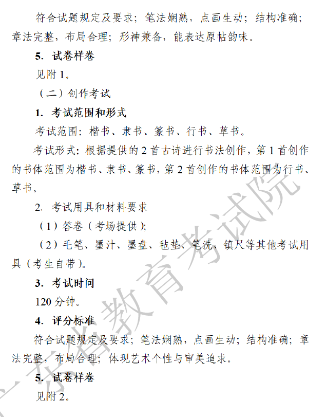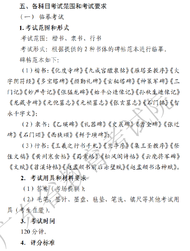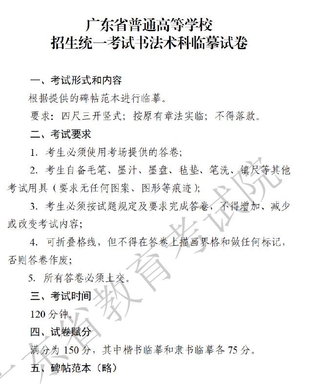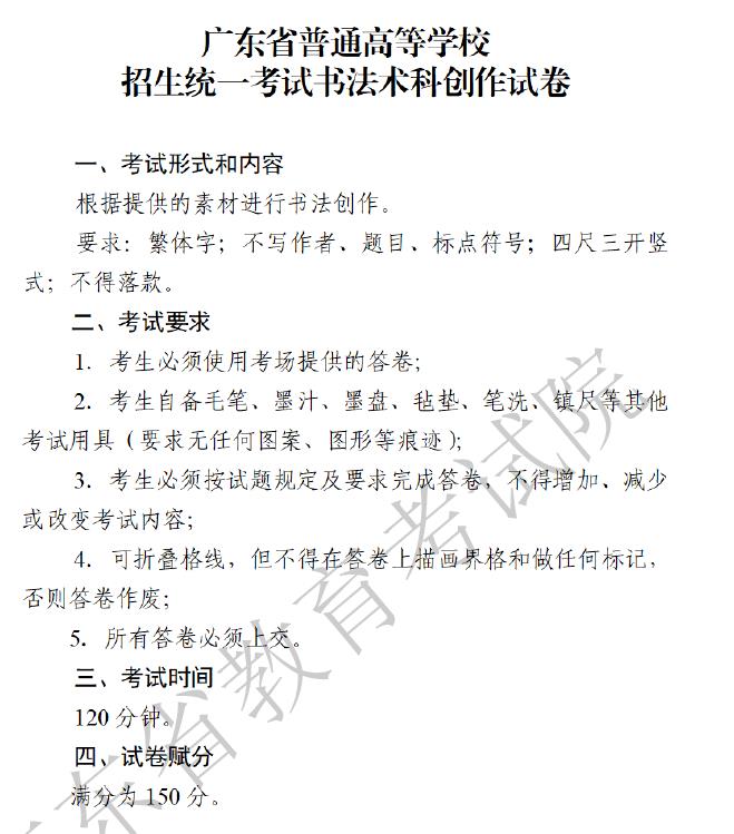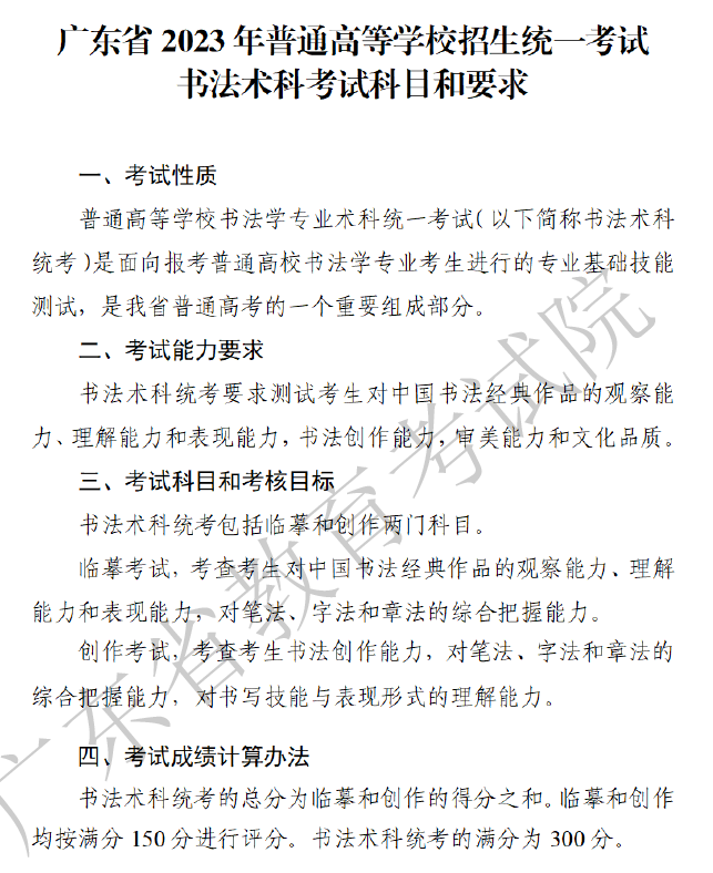 广东省2023年普通高等学校招生统一考试书法术科考试科目和要求