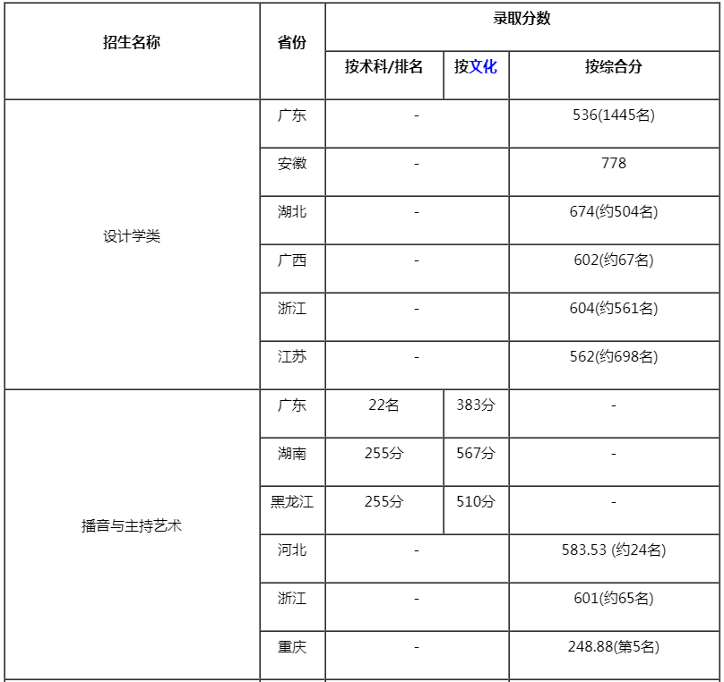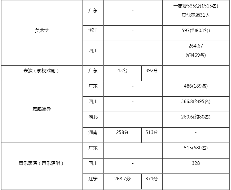 1.按省统考方式且以平行志愿按艺术计划1:1出档的省市相关专业,出档考生,文化总分和术科成绩均达到生源省市划定的最低录取控制分数线,志愿优先,按投档成绩分档至各专业。广东省投档成绩为综合分,其它各省按各省录取文件规定执行。