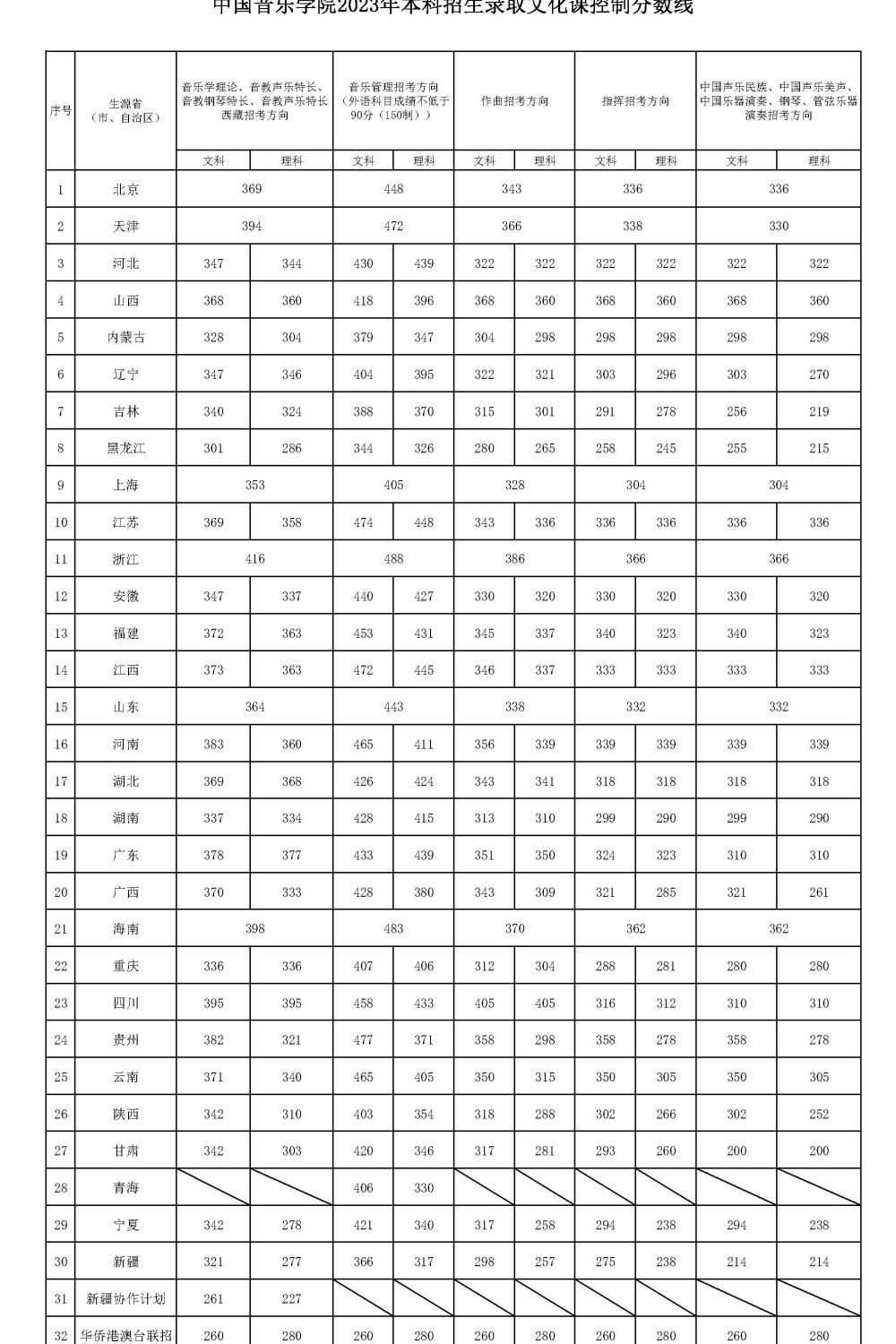 中国音乐学院2023年本科招生录取文化课控制分数线