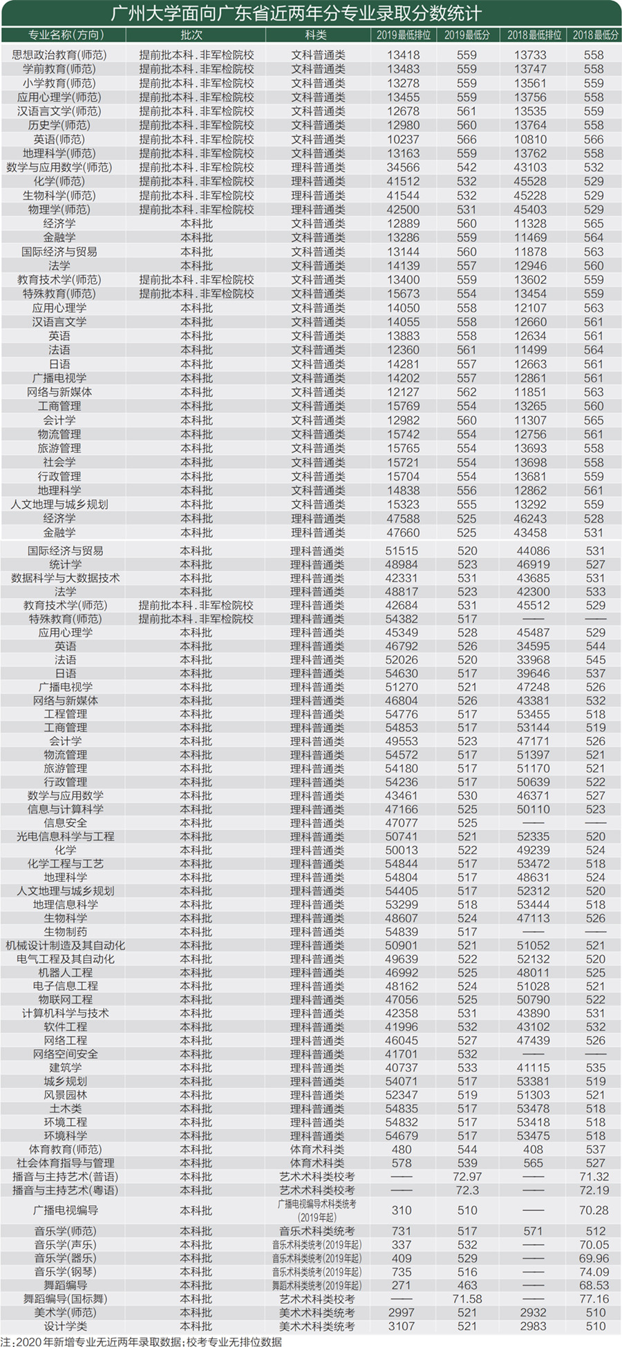 2019年广州大学广东艺术类、体育类统考专业录取分数统计