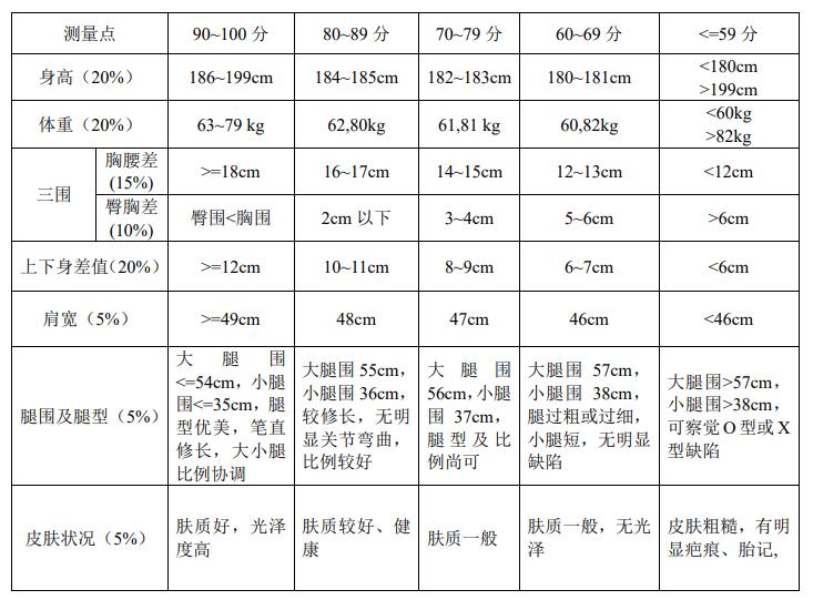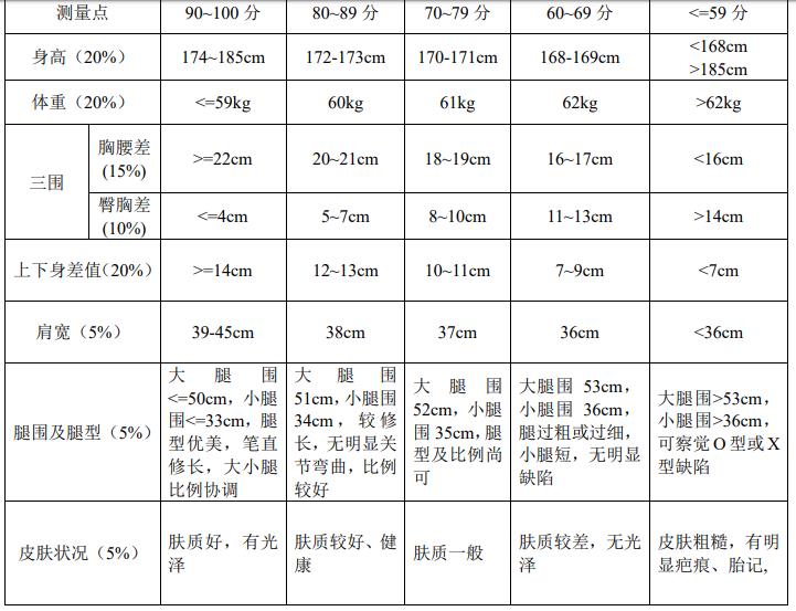 ⑴女:身高 168cm-185cm、体重<=62kg,胸围 77~92,腰围 56cm~66cm,臀围 85~92,大腿围 46cm~