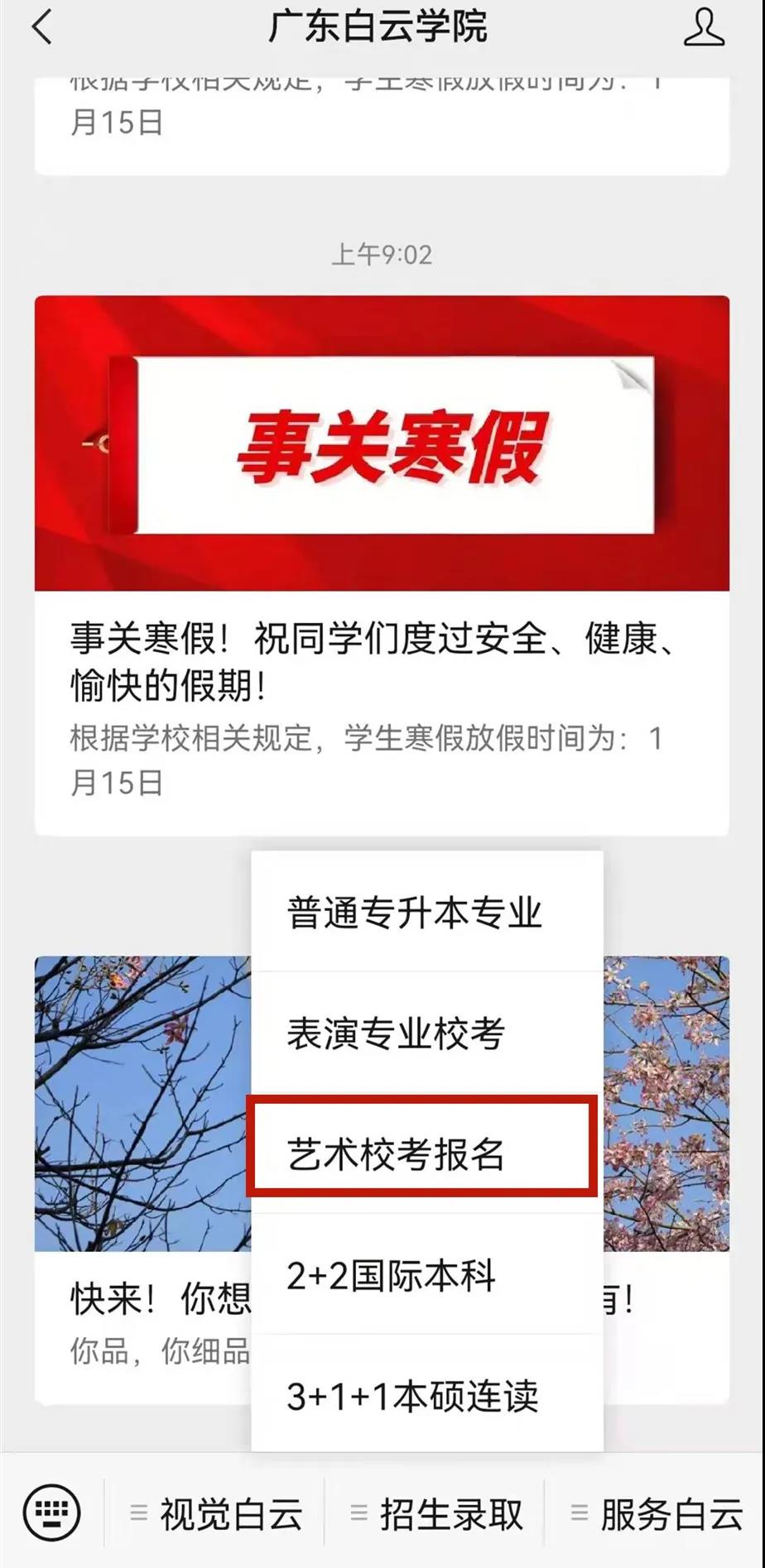 点击进入官微菜单栏,选择“艺术生校考报名”