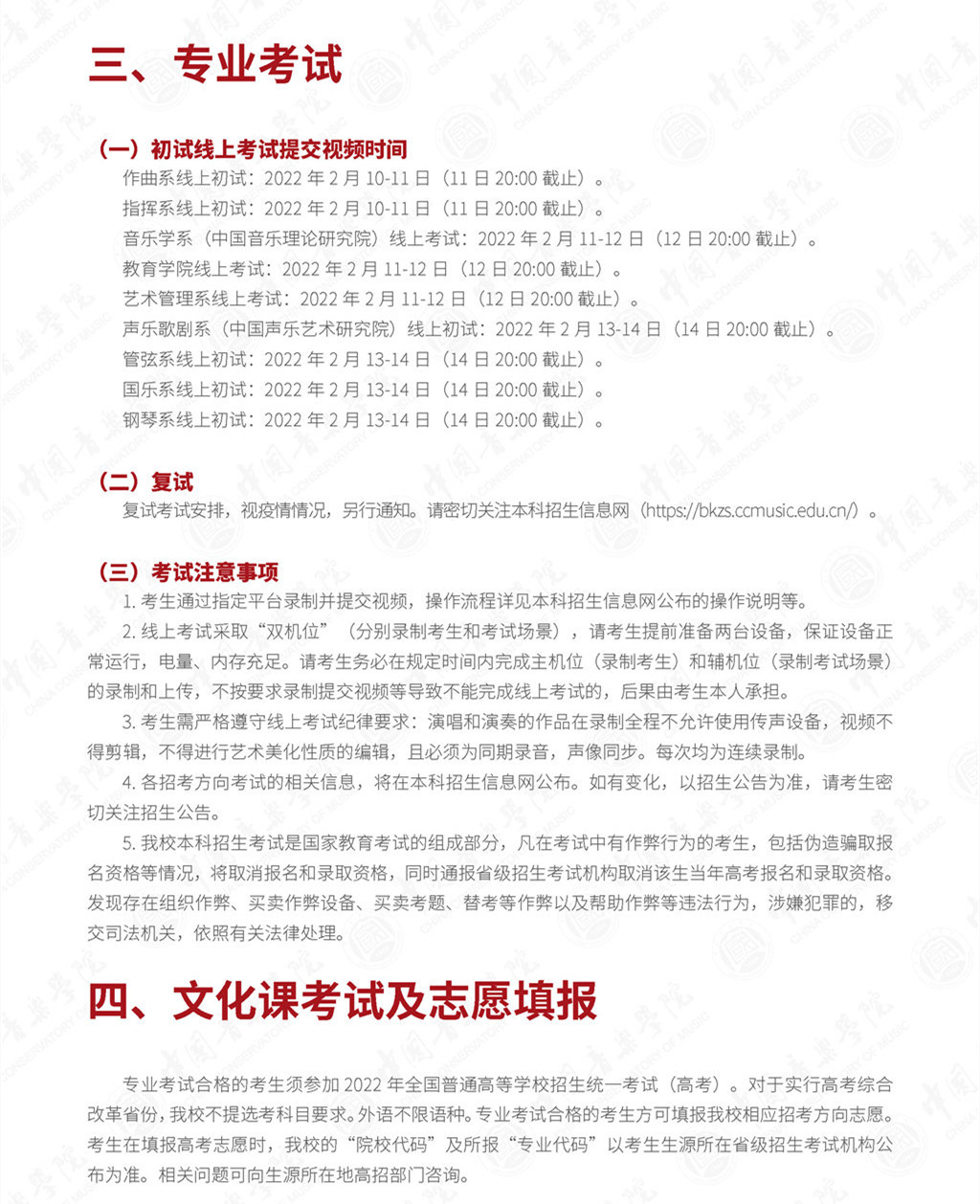 中国音乐学院2022年招生简章,中国音乐学院于1964 年建立,素有“中国音乐家的摇篮”“中国音乐的殿堂”的美誉。学校坚持党的领导,坚持社会主义办学方向,以国学为根基,独具中国音乐教育和研究特色,培养中国音乐理论、中国音乐创作、中国音乐表演等专门人才