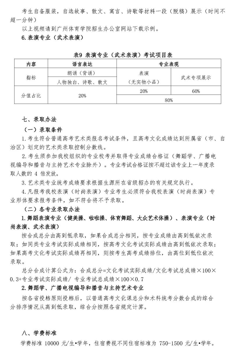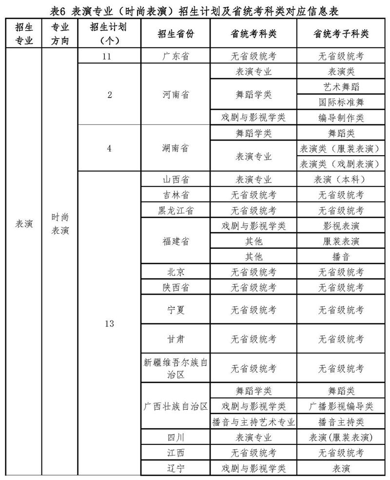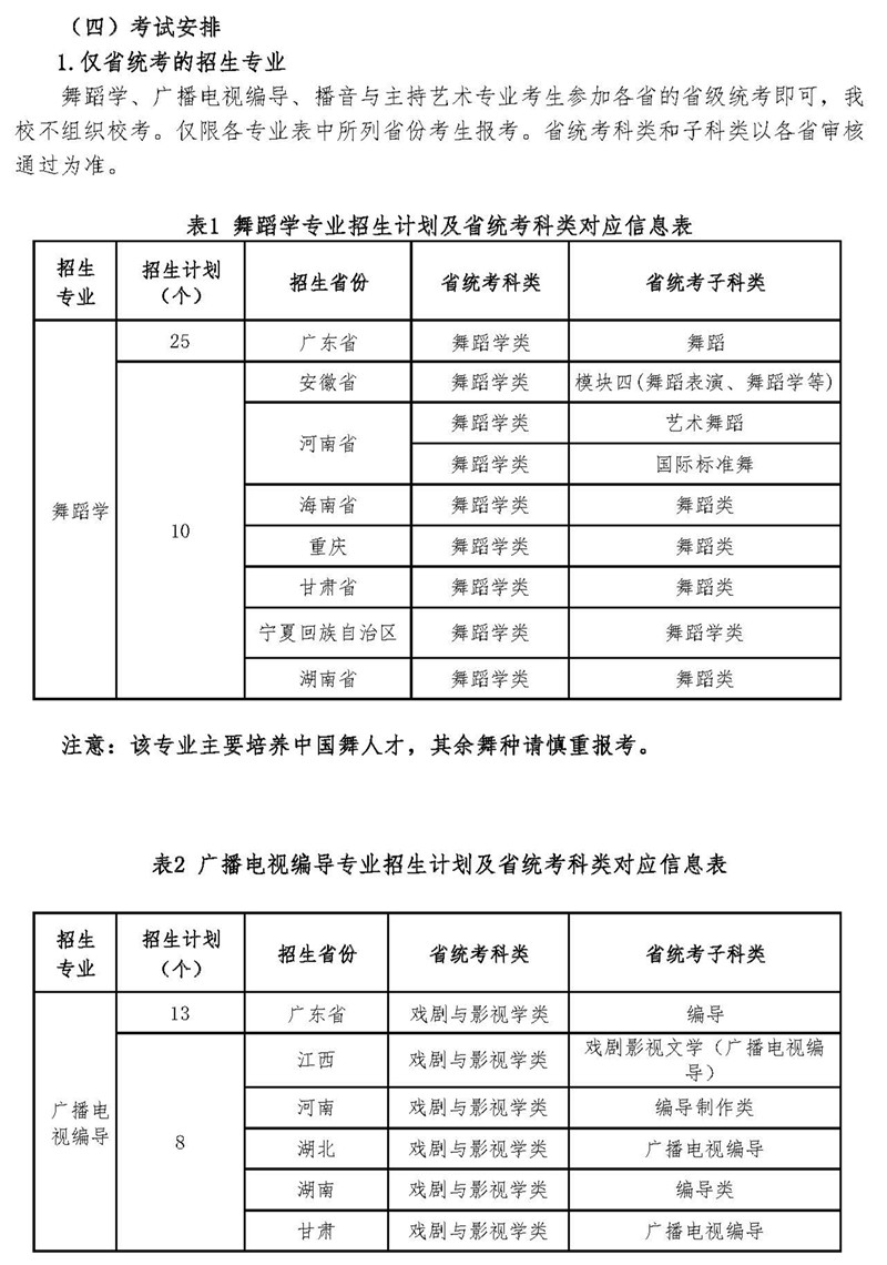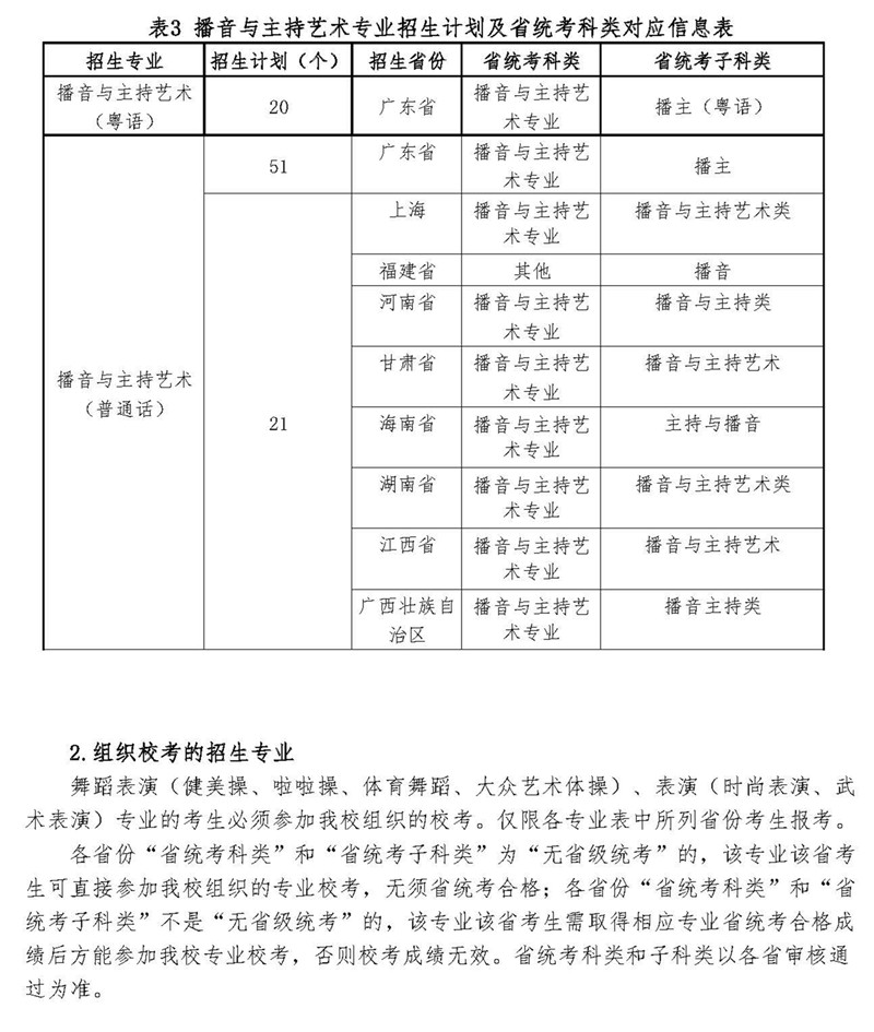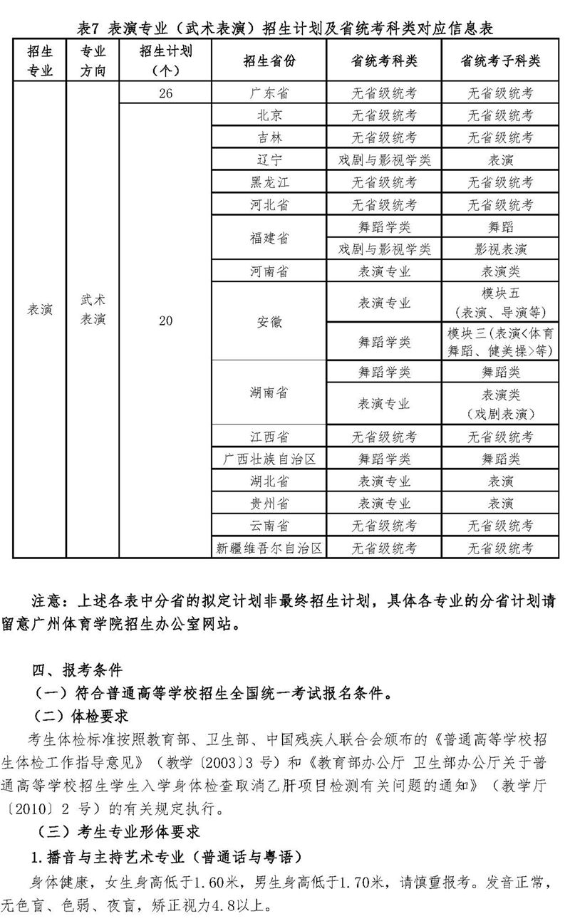 艺术类专业面向全国招生304名(选考科目不限),其中舞蹈表演专业(健美操)计划招生30人,舞蹈表演专业(啦啦操)计划招生25人,舞蹈表演专业(体育舞蹈)计划招生38人,舞蹈表演专业(大众艺术体操)计划招生17人,舞蹈学专业计划招生35人,表演(时尚表演)专业计划招生30人,表演(武术表演)专业计划招生46人,广播电视编导专业计划招生21人,播音与主持艺术专业(普通话)计划招生72人、播音与主持艺术专业(粤语)计划招生20人。具体分省计划详见我校招生办公室网站。