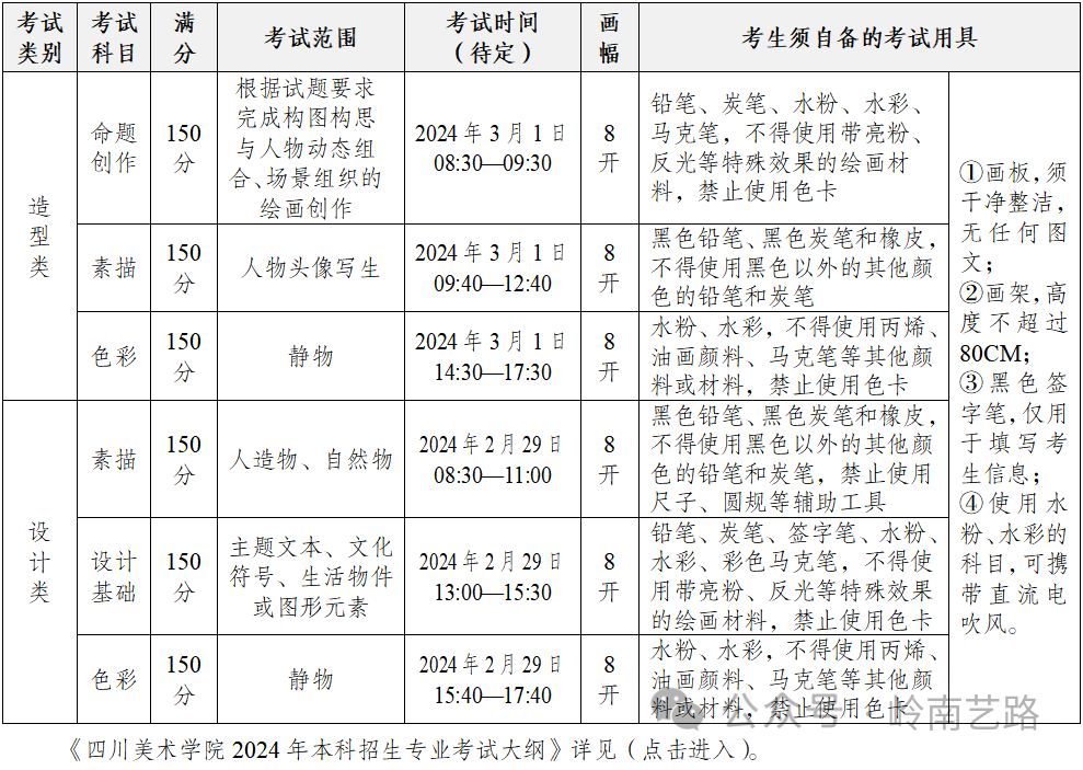 2.考生可登录学校招生处官网自行下载《四川美术学院2024年本科招生简章》。凡报名参加学校2024年本科招生专业考试者,均视为已详细阅读了本简章内容,并充分理解及认可本简章中所述的各项要求、考试方式、录取原则等有关规定。学校2024年本科招生政策以教育主管部门最终审定发布的《四川美术学院2024年本科招生章程》为准。