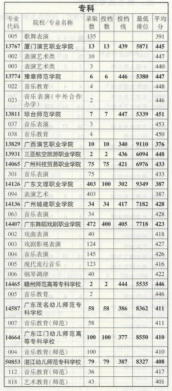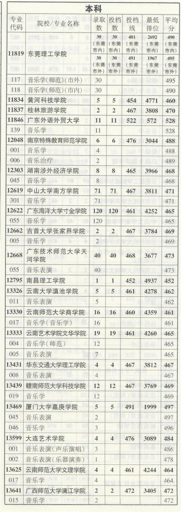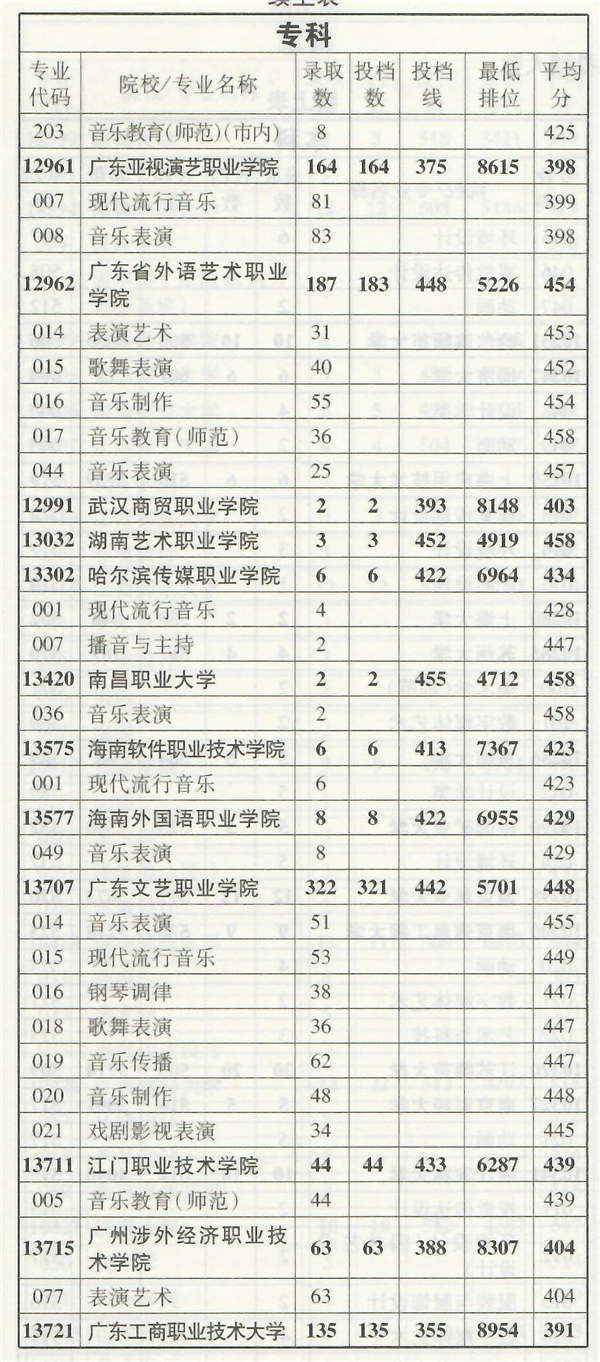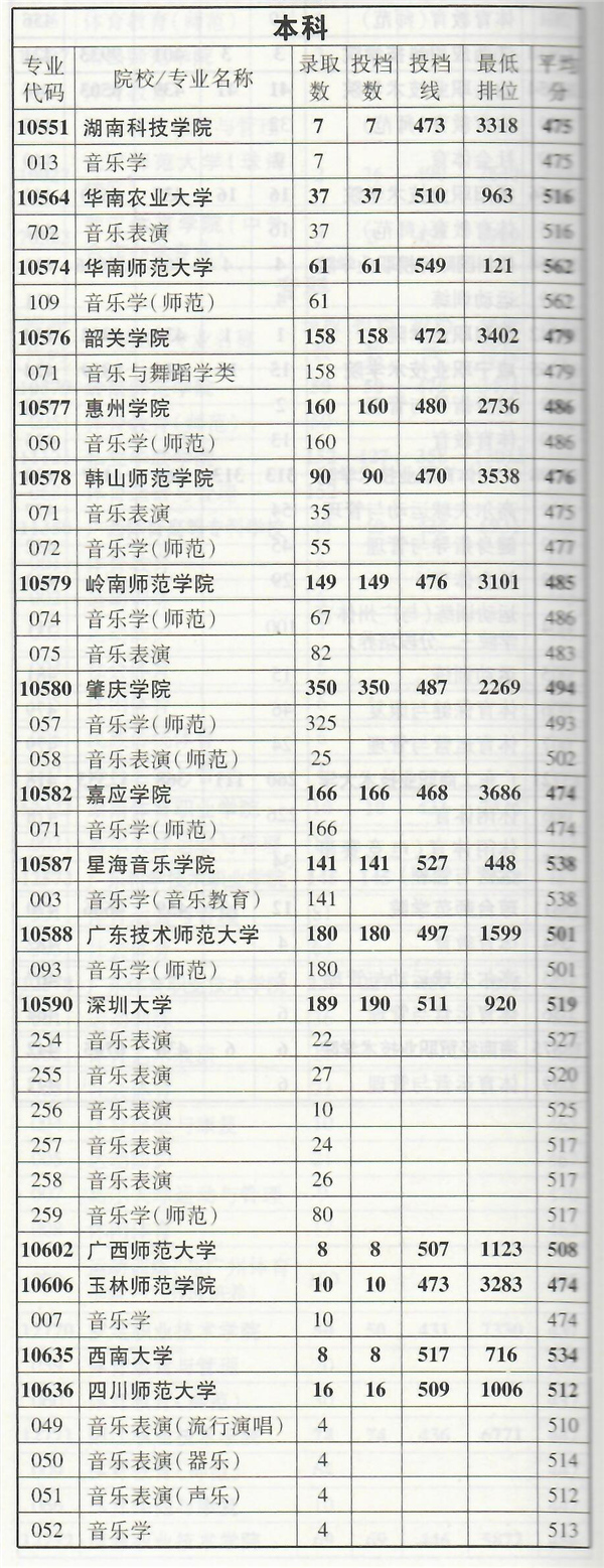 2019年音乐类专业部分在粤招生院校录取情况统计