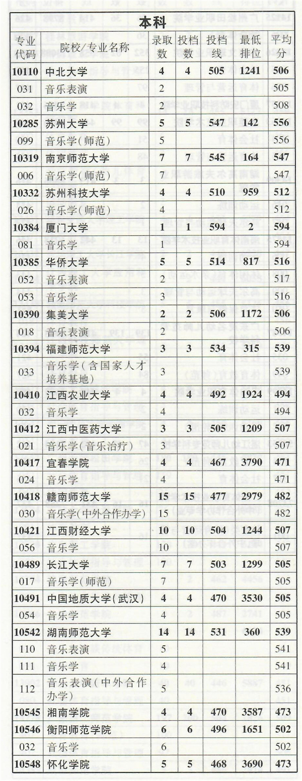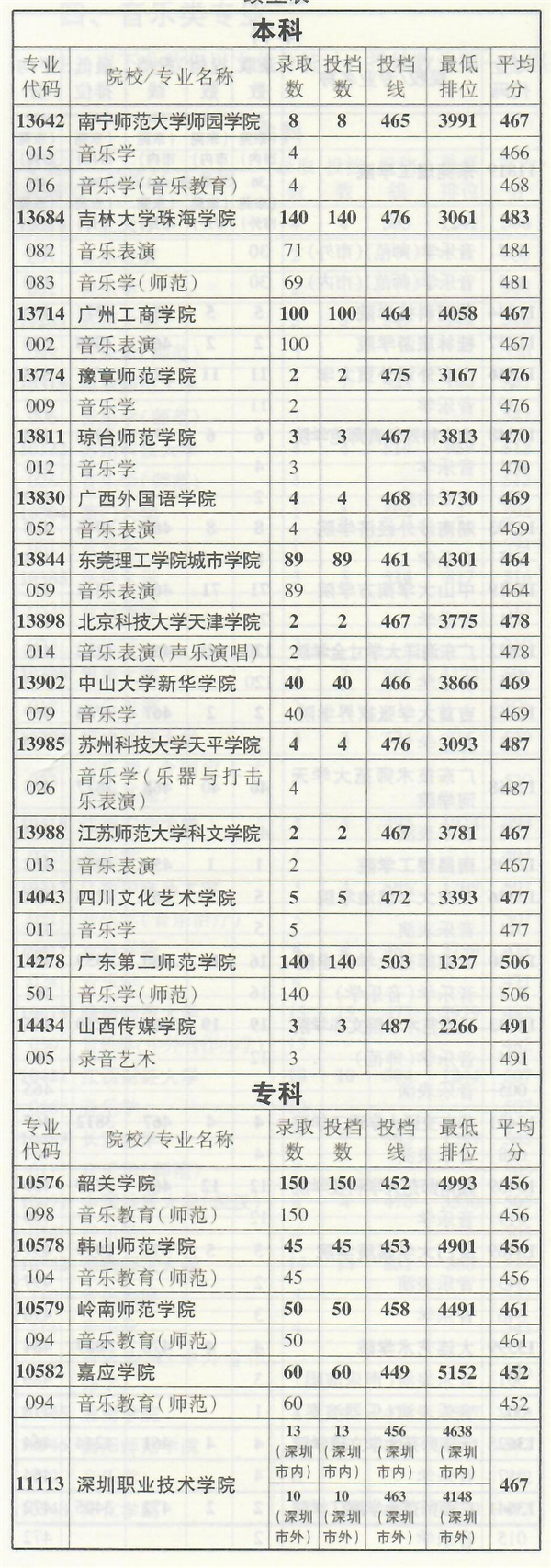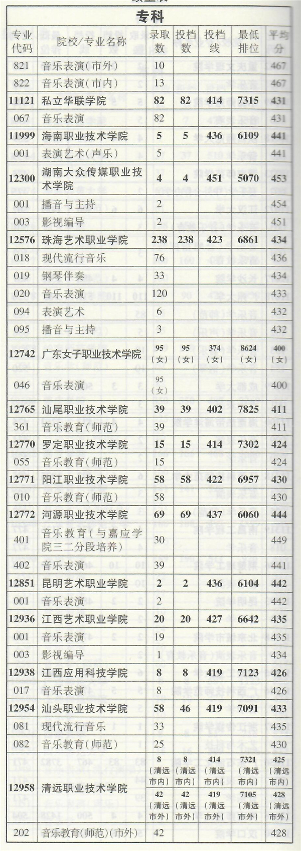 2019年音乐类专业部分在粤招生院校录取情况统计