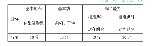 2、成绩评定:成套动作满分为30分。由考评员按评分规则要求,并根据舞蹈的风格、特点、编排、难度、音乐的处理和表现力等进行评分。