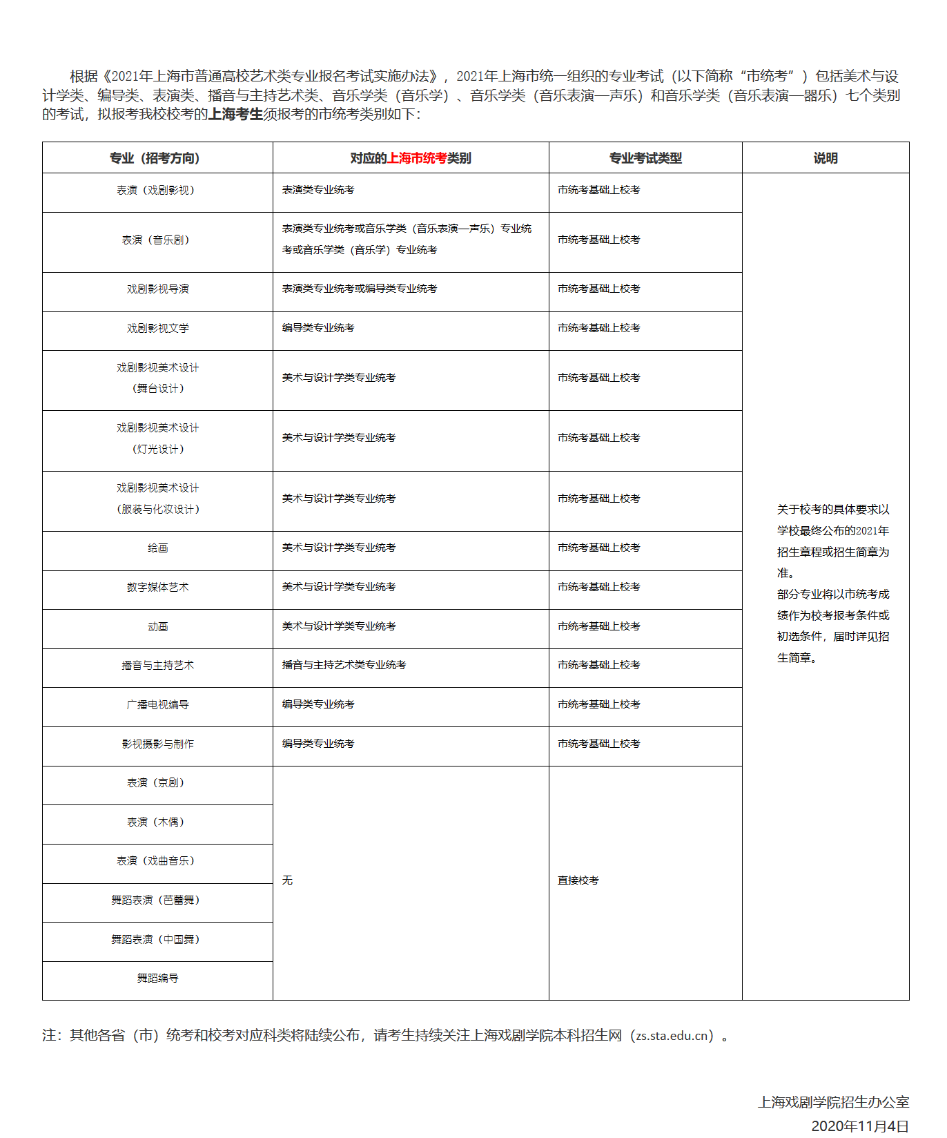 根据《2021年上海市普通高校艺术类专业报名考试实施办法》,2021年上海市统一组织的专业考试(以下简称“市统考”)包括美术与设计学类、编导类、表演类、播音与主持艺术类、音乐学类(音乐学)、音乐学类(音乐表演—声乐)和音乐学类(音乐表演—器乐)七个类别的考试,拟报考我校校考的上海考生须报考的市统考类别如下: