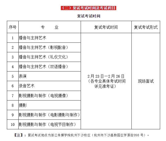 【注】:复试考试地点为浙江传媒学院杭州下沙校区(杭州市下沙高教园区学源街998 号)。