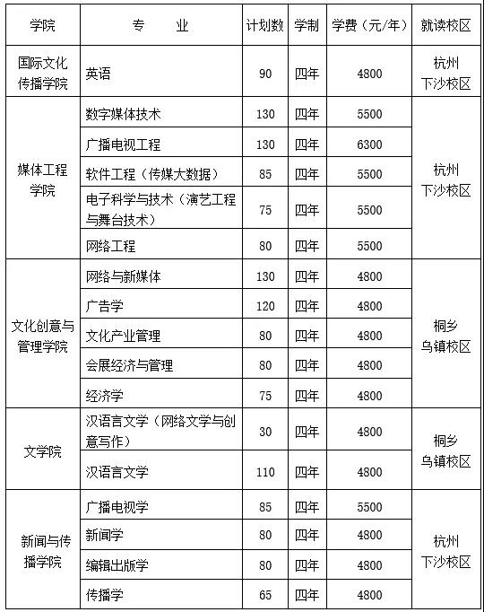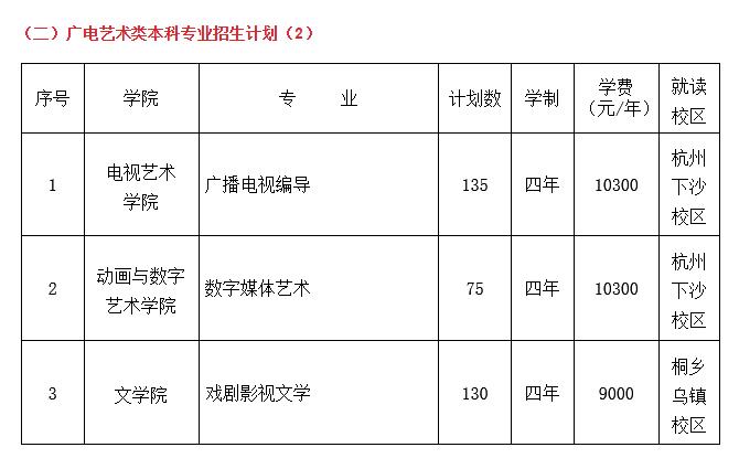 【注】:1.广播电视编导专业拟面向浙江、安徽、福建、甘肃、广东、广西、贵州、河北、河南、黑龙江、湖北、湖南、江苏、江西、辽宁、内蒙古、山东、山西、陕西、上海、四川、天津、云南、重庆等24个省份招生,专业成绩承认相应省统考成绩。