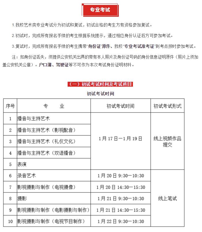 1.初试线上视频作品提交,考生通过专用APP考试平台完成考试;线上笔试,考生通过专用APP考试平台和“钉钉”实时视频监考两个系统完成考试。