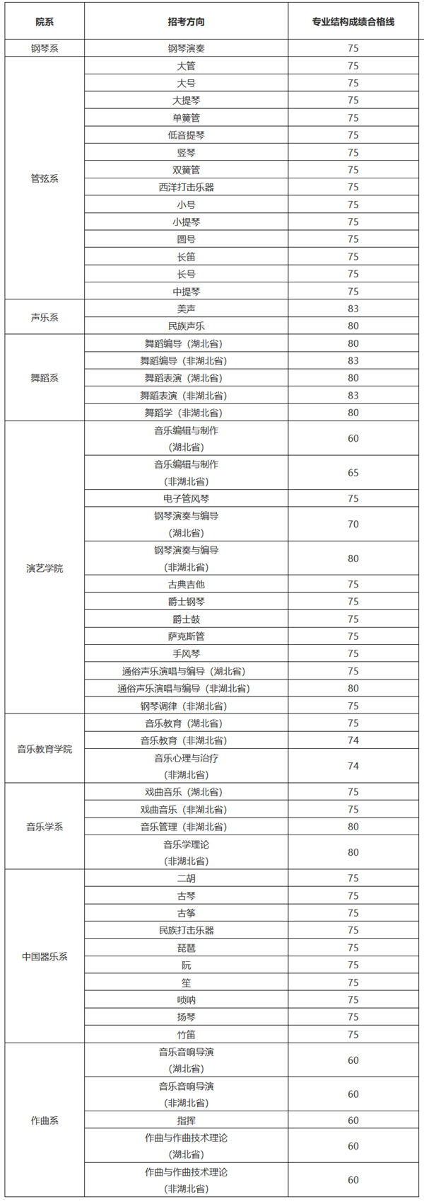 武汉音乐学院2021年普通本科招生专业分数线湖北省考生报考音乐学(音乐学理论、音乐管理、音乐心理与治疗、钢琴调律方向)、舞蹈学专业安排在艺术本科(一)平行志愿模块招生,不再专门划定校考专业考试合格线和发布专业考试合格名单,按照2021年艺术本科(一)平行志愿有关招生录取政策执行。
